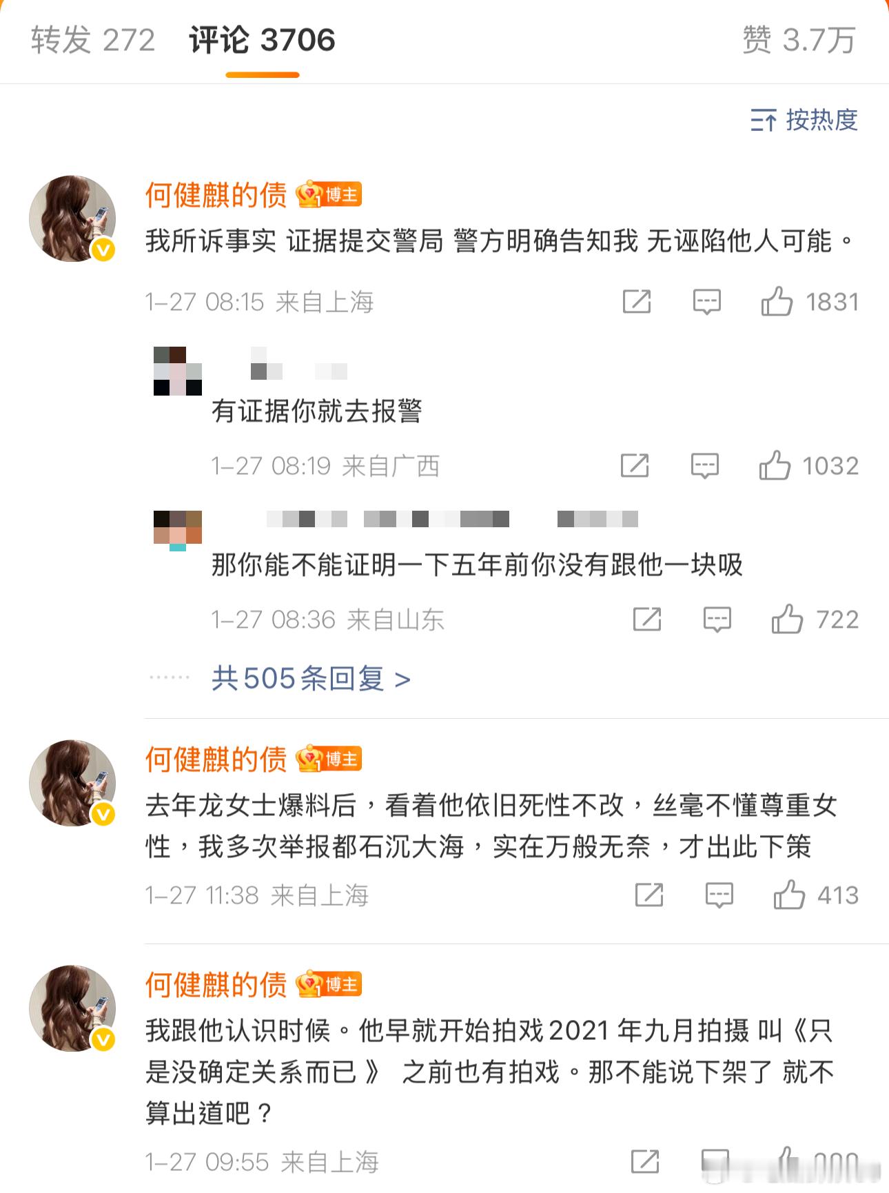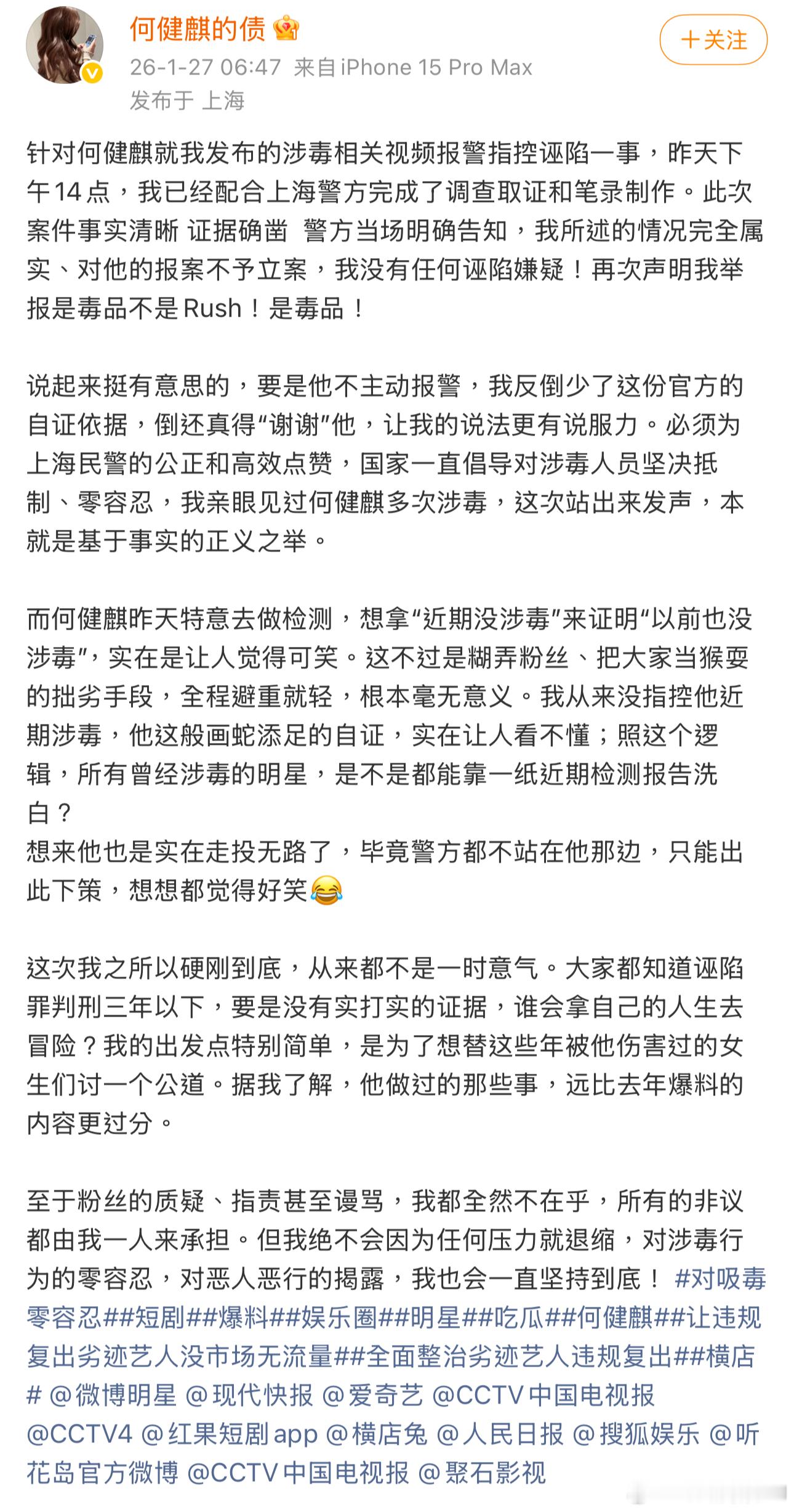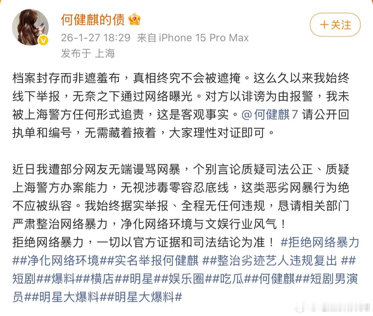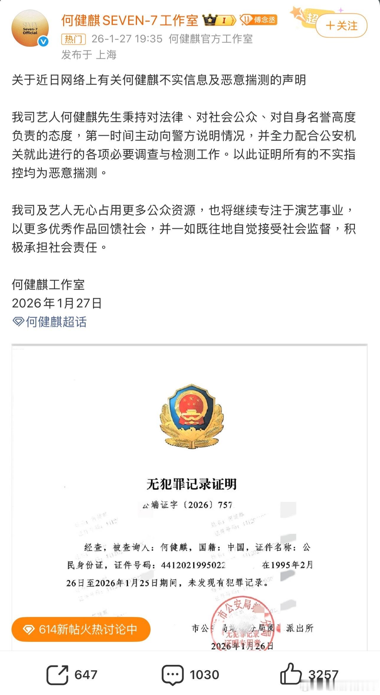何健麒被前女友实名举报后,不但报了案还去做了发检和尿检,但前女友朱女士坚持何健麒这些行为都是迷惑视听的假动作,反复强调上海警方没有给男方报案立案,自己“没有诬陷他人可能”。刚刚何健麒工作室直接放出了何健麒无犯罪证明记录。钢针,好久没见双方态度都这么刚的对抗了。