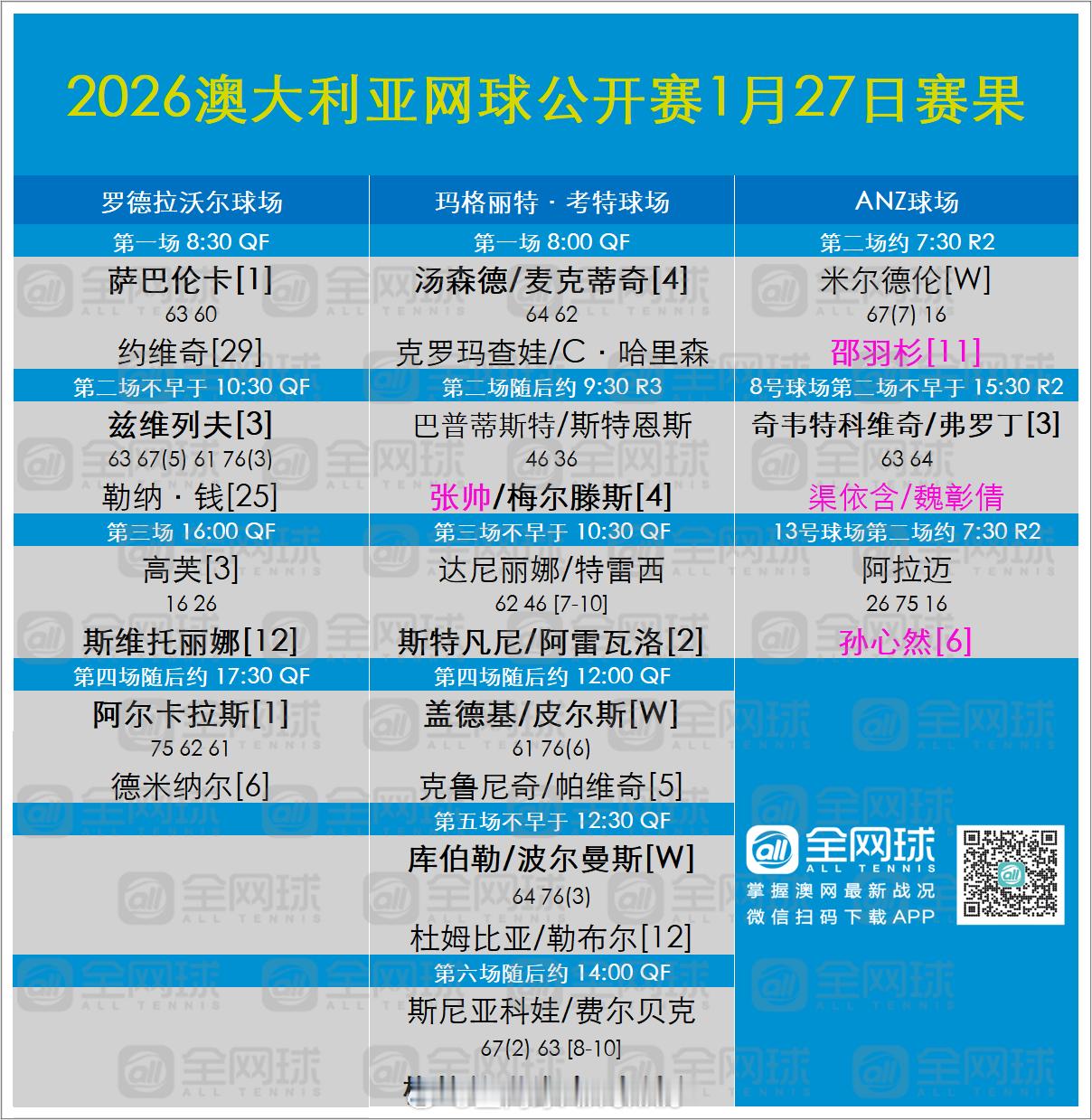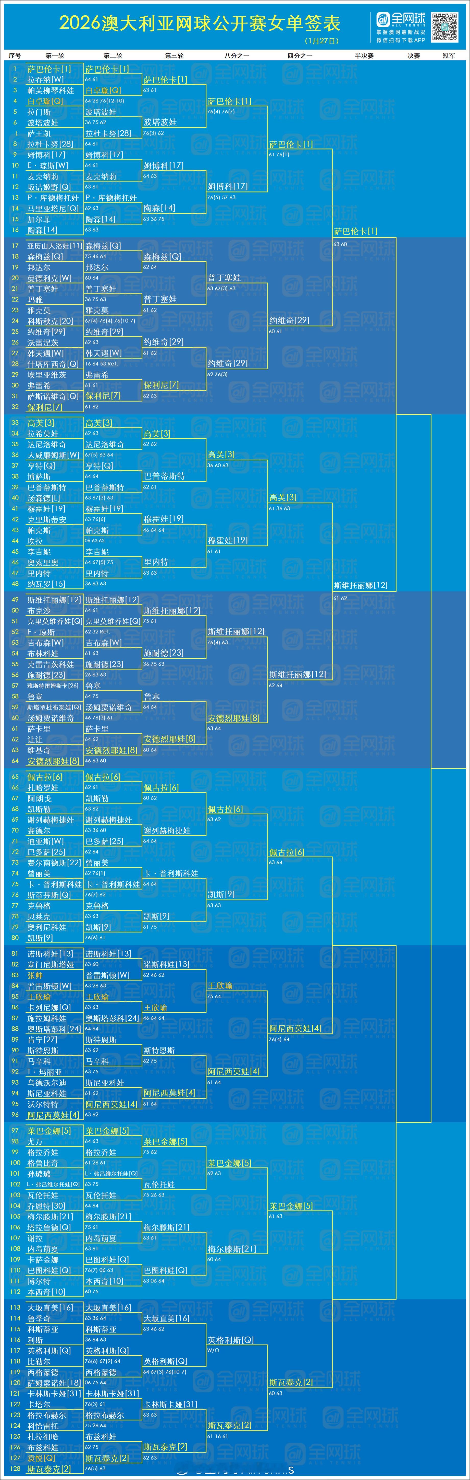 澳网2026 1月27日赛果与签表更新❣️男单上半区半决赛对阵:阿尔卡拉斯vs兹维列夫女单上半区半决赛对阵:萨巴伦卡vs[12]斯维托丽娜这很澳网体育大赏