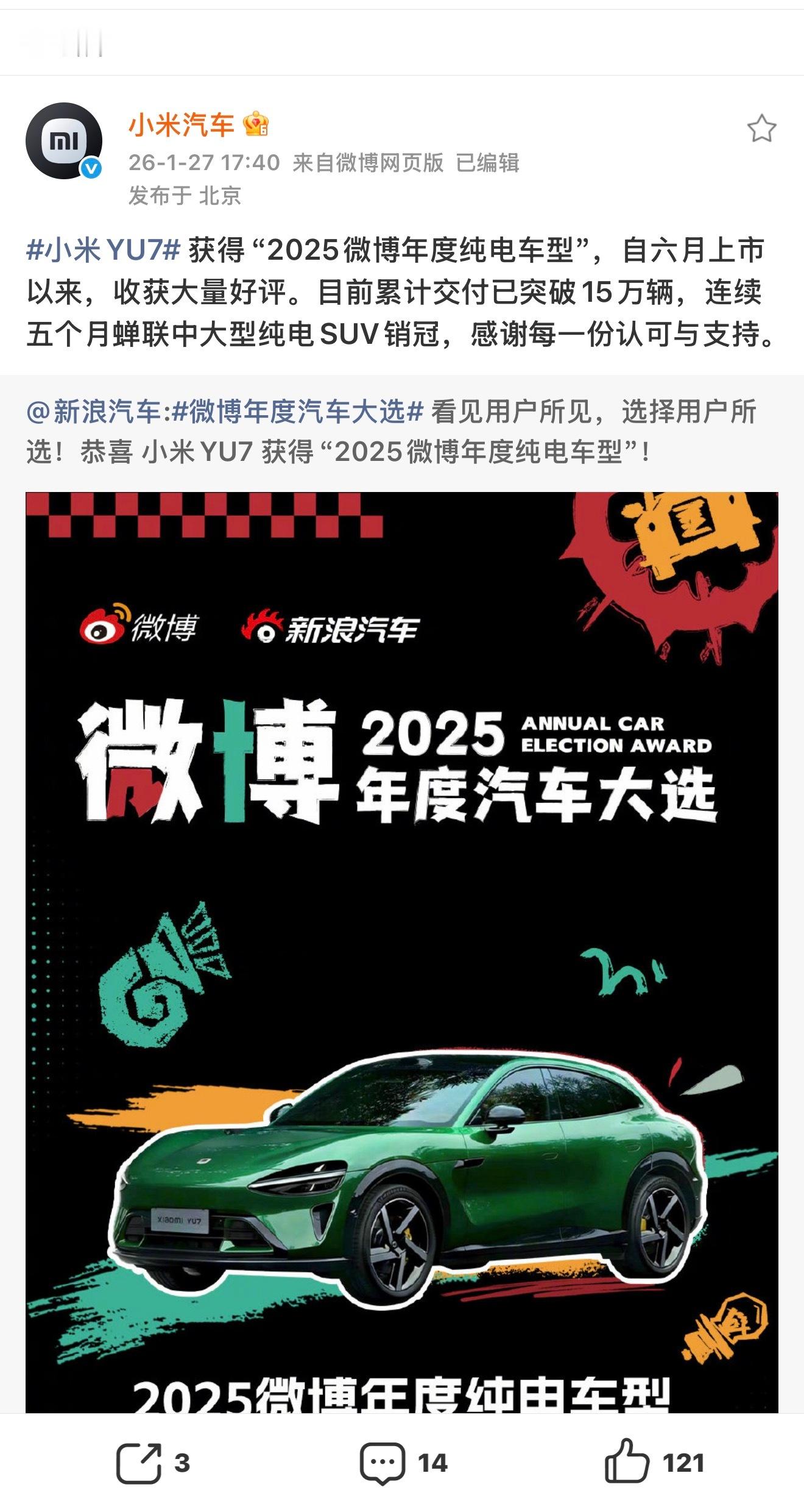 小米YU7获得微博年度纯电车型实至名归!首先小米YU7自上市以来交付持续走高,更是已经连续5个月蝉联中大型SUV榜单第一,上市仅半年整体销量就超过15万辆,这其中还有交付爬坡阶段。即便如此,小米 YU7 已经证明了,它是集性能、操控、续航、智能、颜值等多项优势于一身,六边形战士。只有开过了才知道有多香!