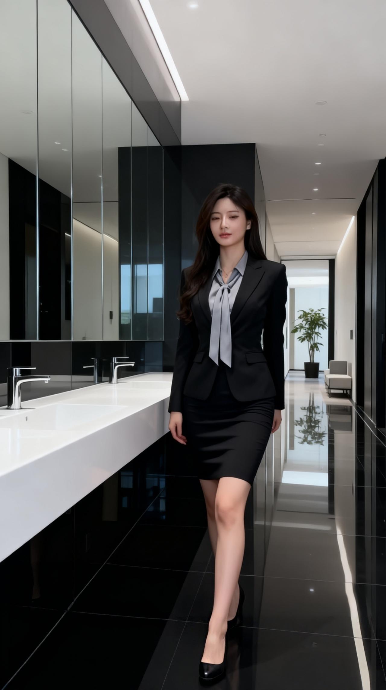 温柔的粉色西装套裙,配上一双薄款黑色丝袜,整体造型既显职场干练,又透着柔和优雅的