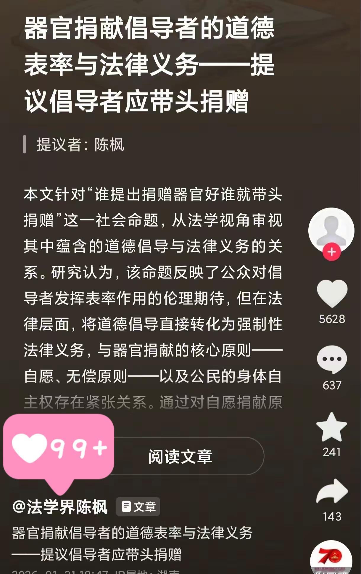 法学界陈枫直接怒怼专家:要是觉得器官移植是好事,专家就该带头捐器官,谁提出来谁先上,这话听着糙,却把那些站着说话不腰疼的人给怼哑了。 这话像一把生锈的刀,猛地划开某些精致包装的提案表皮。陈枫的怒吼里藏着普通人的直觉:道德不能总是自上而下地分配。那些在高档会议室里高谈阔论移植体系改革的专家,可曾想过自己会成为数据表里的一行数字? 看看现实吧。中国每年约有30万患者等待器官移植,而实现移植的仅2万例左右。冰冷的数字背后是一个个在等待中熄灭的生命。当讨论脱离肉体,成为纸面上的政策博弈,伦理就变成了空中楼阁。 陈枫撕开了这层遮羞布。倡议者是否愿意将自己纳入所倡导的系统?这个问题刺穿了所有虚伪的修辞。如果移植真是如此崇高的利他行为,为什么压力总是倾斜向沉默的大多数? 我们见过太多这样的场景:专家们设计着“完美”的制度方案,却住在制度的例外区。他们谈论捐献就像谈论天气,轻松得仿佛与己无关。这种割裂让公众产生本能的不信任,就像劝人登船的水手自己却站在岸上。 器官捐献的本质是极致的给予。它需要超越理论的勇气,需要血肉相连的共情。当倡导者躲在抽象概念后面指点江山,这种倡导本身就失去了道德重量。人们嗅到了 hypocrisy 的气味。 陈枫的“糙话”之所以有力,因为它回归了最基本的公平原则:己所不欲,勿施于人。在要求公众做出巨大牺牲前,倡议者是否准备好了同等付出?这个问题简单到孩童都能理解,却让很多专家难以直面。 这不是反对器官捐献。恰恰相反,只有当倡议者愿意身先士卒,制度的公信力才能建立。挪威、西班牙等国捐献率高的背后,是整个社会从上到下形成的生命共同体意识。领袖和专家不仅是制度的制定者,更是其第一批践行者。 那些被怼哑的专家,或许该感谢陈枫这记当头棒喝。它提醒所有人:在谈论生命的重量时,我们最好都把手放在自己胸口,感受那颗真实跳动的心脏。理论可以修饰,数据可以美化,但面对生死抉择时的犹豫或勇敢,做不了假。 道德领导力从来不是靠说服别人牺牲建立的。它始于“跟我上”的勇气,成于“一起走”的信任。器官捐献这项关乎生命延续的伟大事业,需要更多这样的真实。 各位读者你们怎么看?欢迎在评论区讨论。