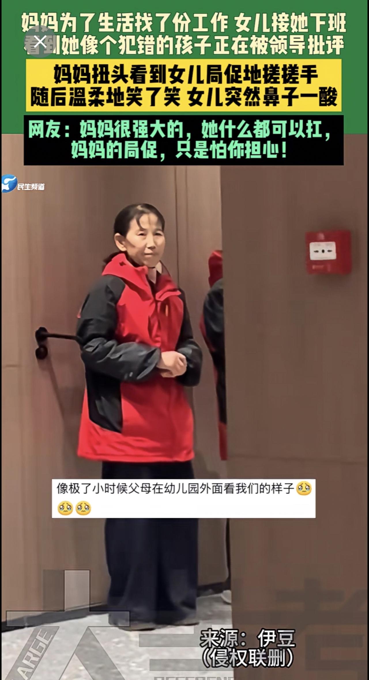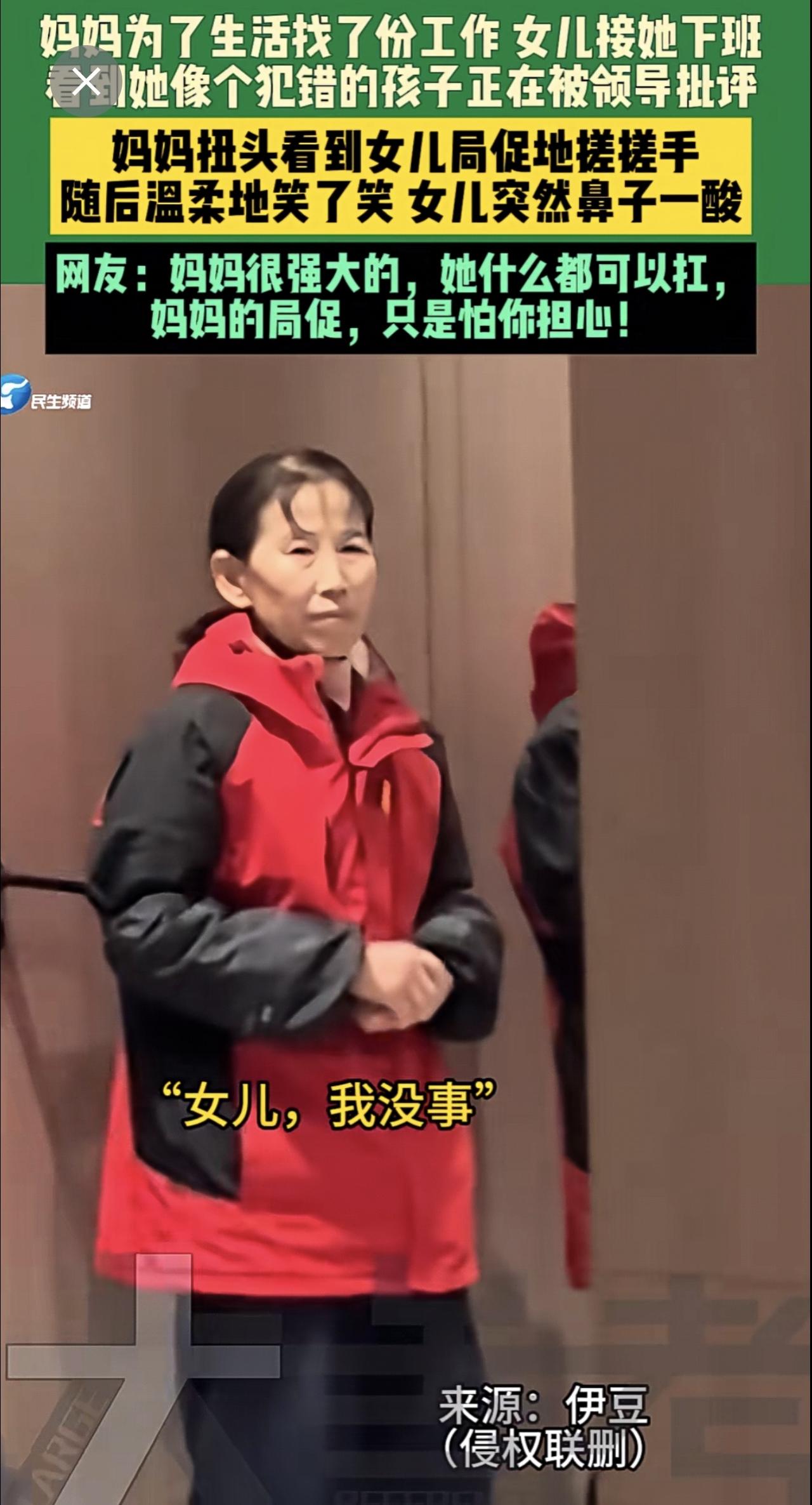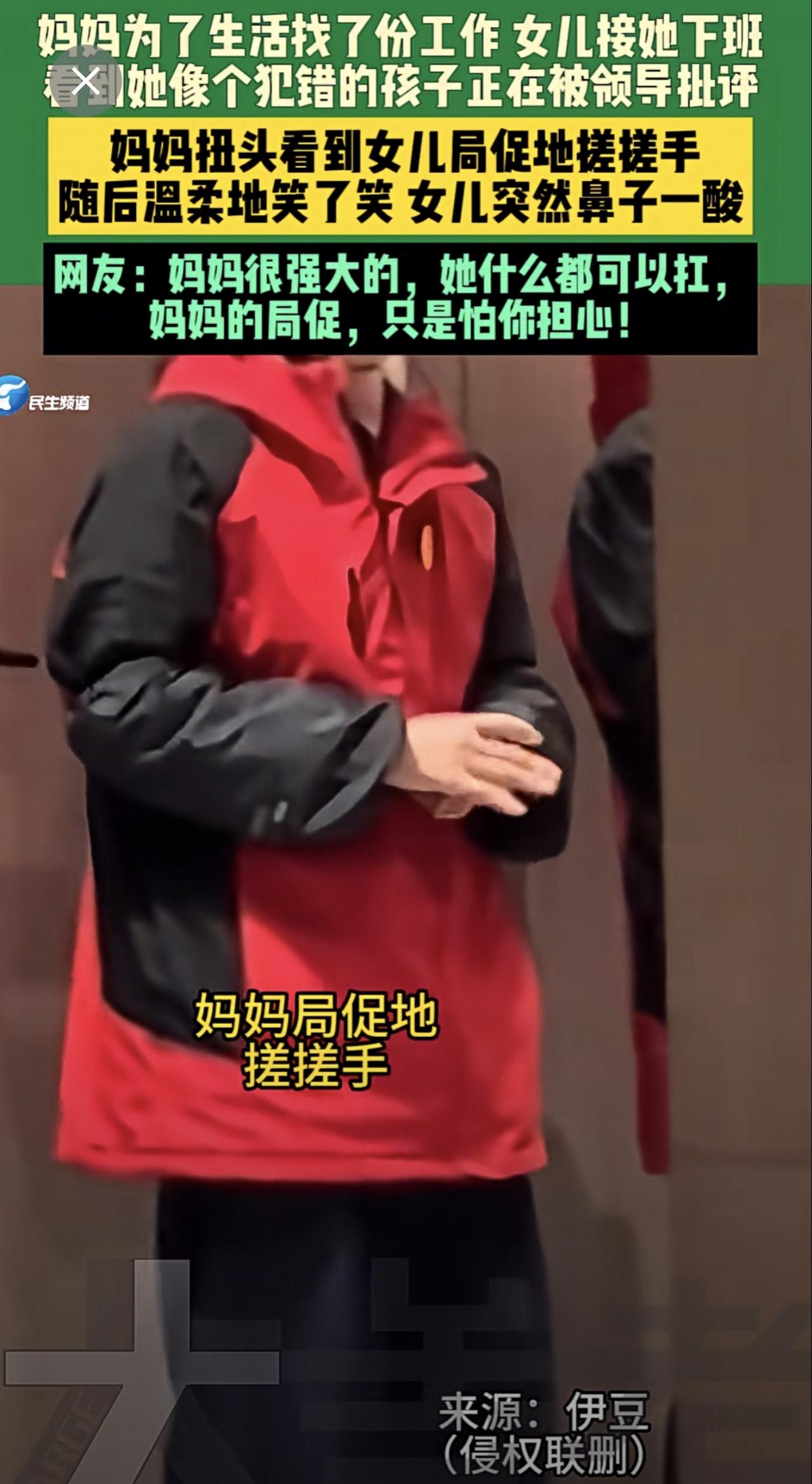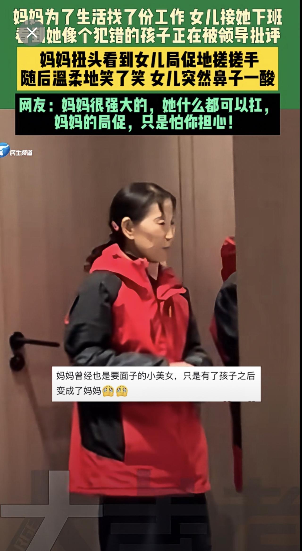 1月27日(发布)陕西 妈妈为了生活找了份工作 女儿接她下班 看到她像个犯错的孩子正在被领导批评 妈妈扭头看到女儿局促地搓搓手随后温柔地笑了笑 女儿突然鼻子一酸 网友:妈妈很强大的,她什么都可以扛,妈妈的局促,只是怕你担心!