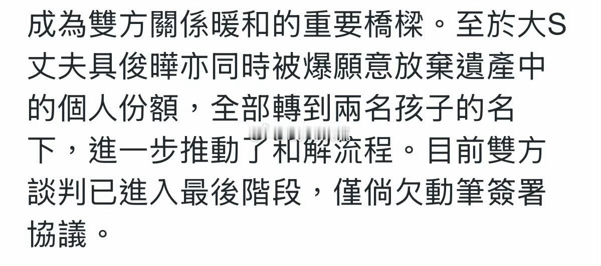 曝具俊晔将放弃大S遗产中的个人部分具俊晔将大S遗产转到两孩子名下 台媒曝,具俊晔将放弃大S遗产中个人部分,全部转到大S两名孩子名下。