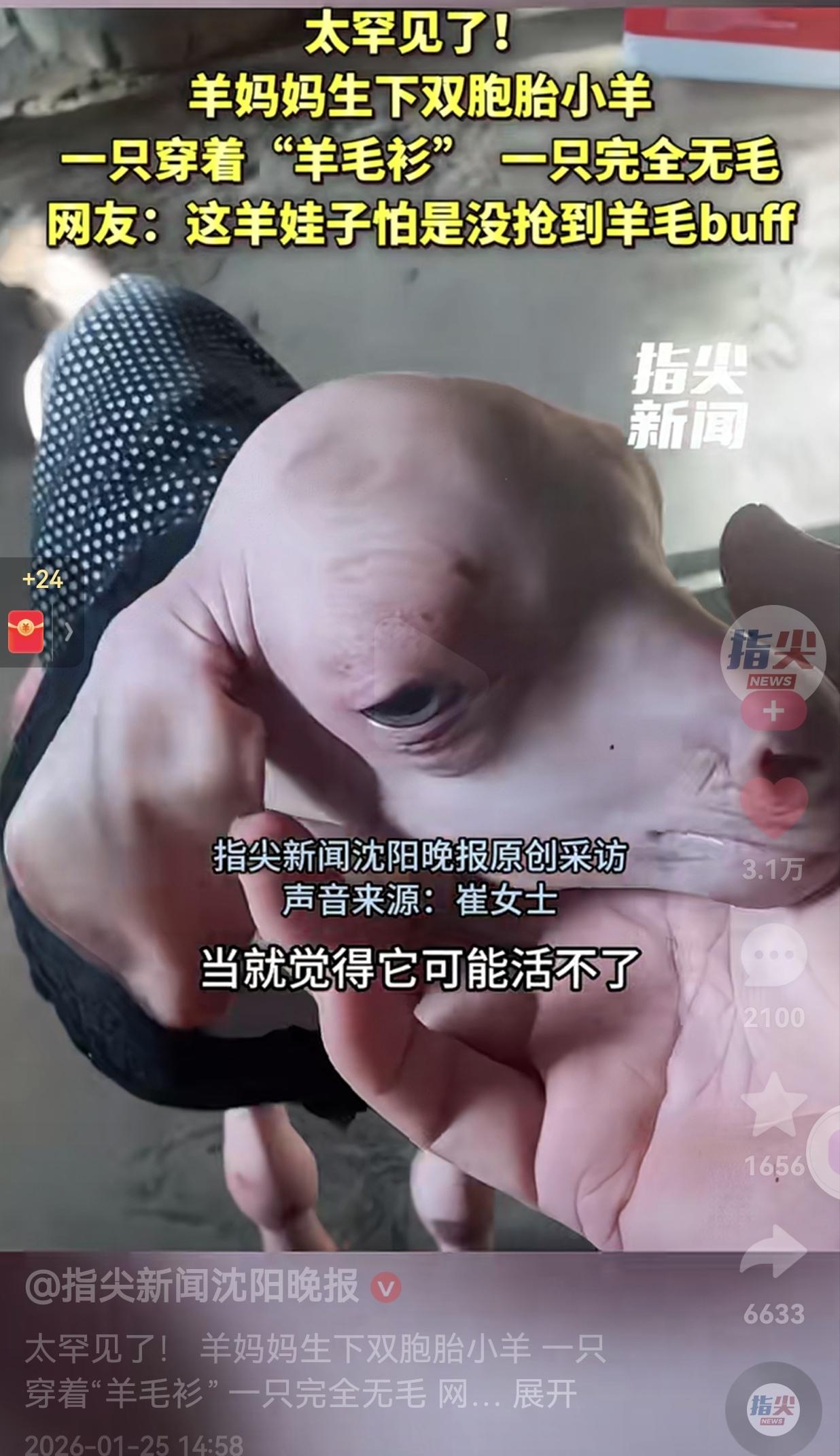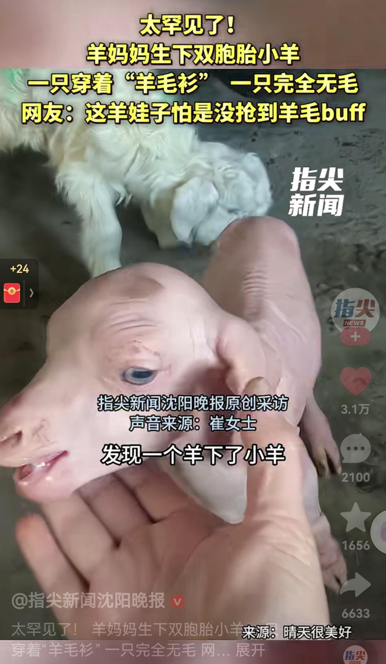 这是基因突变吧!真的太稀有了!零下38度的东北,天寒地冻,一位养羊十几年的崔大姐,和老公一起去给羊喂草时,发现自家羊妈妈刚生了一对双胞胎小羊。 一只裹着厚厚的“羊毛衫”,圆滚滚软乎乎的,另一只却浑身光溜溜,连一根毛都没有,皱巴巴的皮肤在寒风里冻得通红。 崔大姐看到后,很是担心:“养羊十几年,头回见这样的,我当时就觉得它可能活不了。” 可崔大姐没放弃,她赶紧把这只无毛小羊抱回屋里,给它盖上厚毯子暖和了一会儿,小家伙缓过来,居然慢慢站起来,还拱着要找奶喝。 大姐像照顾自己孩子似的,给它穿上了小衣服保暖,还怕羊妈妈的奶不够,专门用奶瓶人工补喂。 为了让这个小家伙不再受冻,大姐干脆把羊妈妈也领到了房子里,让这对特殊的母子待在暖和的地方。 几天过去,奇迹真的发生了,这只小羊不仅活了下来,还能蹦跶着跟其他小羊抢食,吃饱了就撒欢儿,活泼得跟正常小羊没两样! 邻居们听说了都跑来看,围着这只稀罕的小羊笑个不停,说活这么大第一次见,又好笑又心疼。 只是它终究跟别的小羊不一样:别的小羊都能跟着妈妈在圈里跑,它却必须一直待在房子里,靠那件小衣服抵御严寒。  网友看到后评论说:“这羊娃子怕是没有抢到羊毛buff吧!” 还有的网友说:“这只羊可以把它养大,养大之后,可以成为网红羊了。” 这只羊能活下来,全靠崔大姐的不忍心,还有那股子“我再试试”的劲儿。 咱们总说“万物有灵”,其实很多时候,动物的命运就攥在人类的手里。所以,有时候多一份观音,多一次伸手,就能给它们一个活下去的机会。