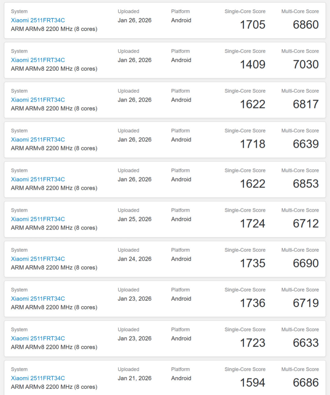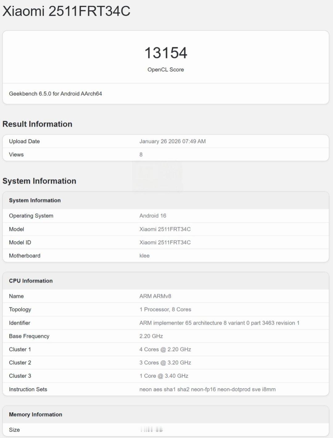 【REDMI Turbo 5 手机跑分曝光:天玑 8500 芯片 +12GB/16GB 内存】型号为 2511FRT34C 的小米手机近日现身 GeekBench 跑分库,目前共有 10 条 CPU 记录和 1 条 GPU 纪录,该机搭载联发科天玑 8500 芯片,配备 12GB 或 16GB 内存,基于此前 GSMA IMEI 数据库,该机上市后为小米 REDMI Turbo 5 手机。按照 GeekBench 6.4.0 版多核得分排序,最高一条记录小米 REDMI Turbo 5 手机单核得分 1409 分,多核得分为 7030 分。此外 GPU 跑分页面显示,小米 REDMI Turbo 5 手机 OpenCL 得分为 13154 分。页面信息显示,小米 REDMI Turbo 5 手机将搭载联发科天玑 8500 芯片,相比较天玑 8400 芯片,单核性能提升约 2%,多核性能提升约 9%,而 GPU 图形性能的涨幅约为 7%。