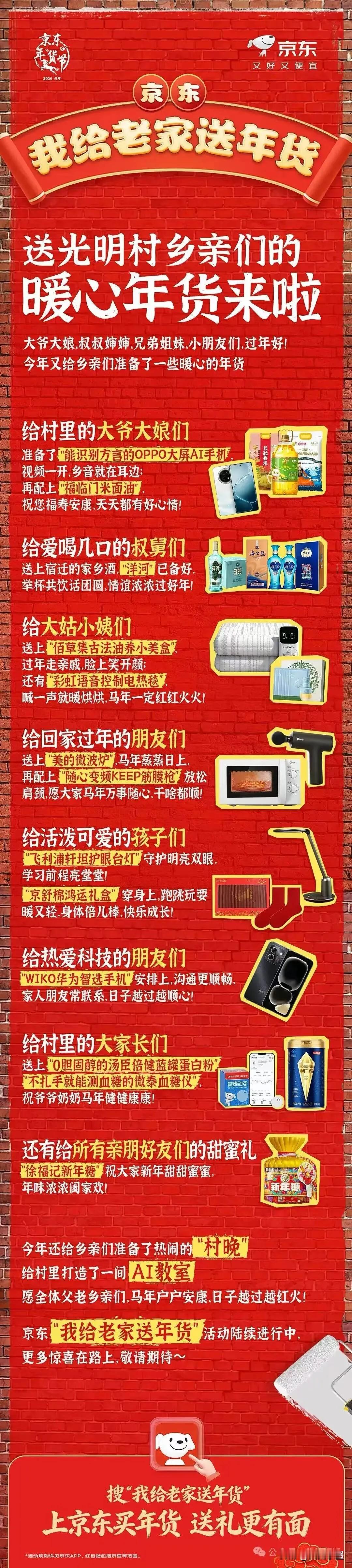 刘强东不仅有钱,还有心,更懂得感恩,从今年给父老乡亲们准备的年货清单来看,他是真的用心分析了村里各类年龄段群体的实际情况和需求,有针对性的准备了年货,并不是一股脑的分钱发物! 我们一起来看下价值3000万的年货里都有什么? 给说不惯普通话的大爷大妈们,他准备的是能识别方言的大屏幕手机。 给喜欢喝几口叔叔舅舅们,他准备的是当地名酒“洋河”系列! 给爱美的大姑小姨们,他准备的是古法油养小美盒。 给活泼可爱的孩子们,他准备的是护眼台灯。 给热爱科技的朋友们,准备的是最新款的智能手机。 给年纪大了的长辈们,他准备的是汤臣倍健的蛋白粉,不扎手就能测血糖的血糖仪! 另外,他还打造了一间AI教室,让村里人都能感受一下AI科技带来的震撼! ………… 当然,他还给村民们准备了一场两个小时的“村晚”。既充实了村民们的物质生活,又丰富了村民们的精神生活,两全其美! 刘强东每年能在百忙之中花时间心思为大家准备年货,一是说明他有心,二是说明他是一个懂得感恩不忘本的人!希望京东越来越好!