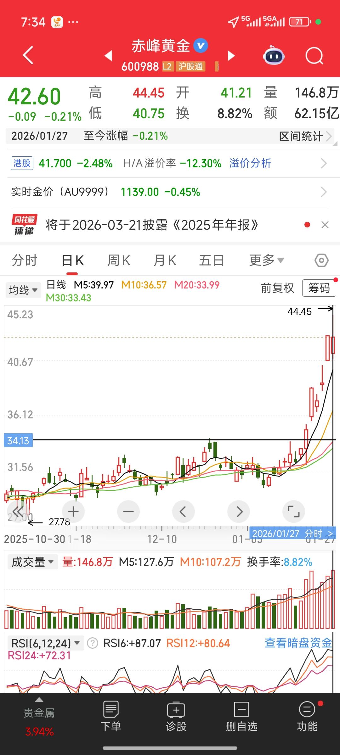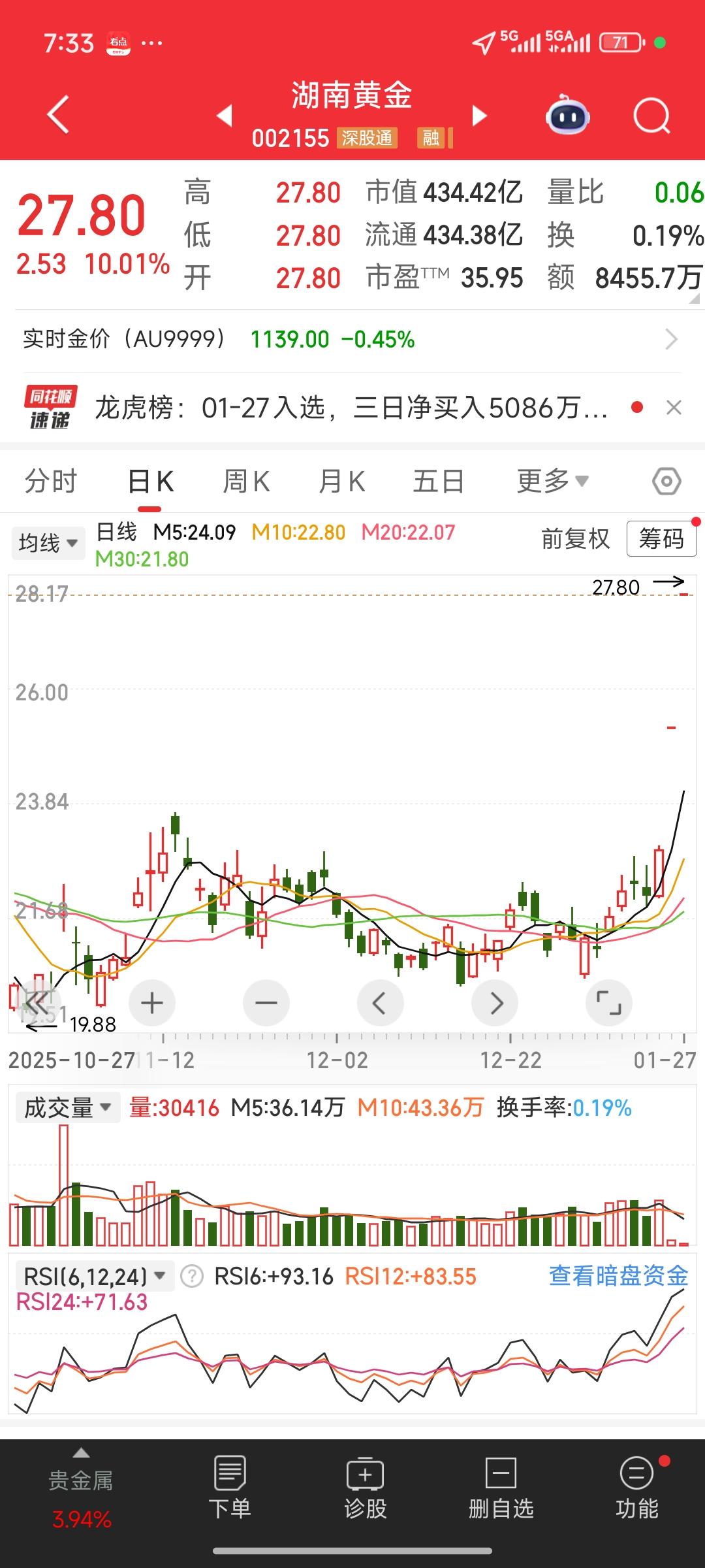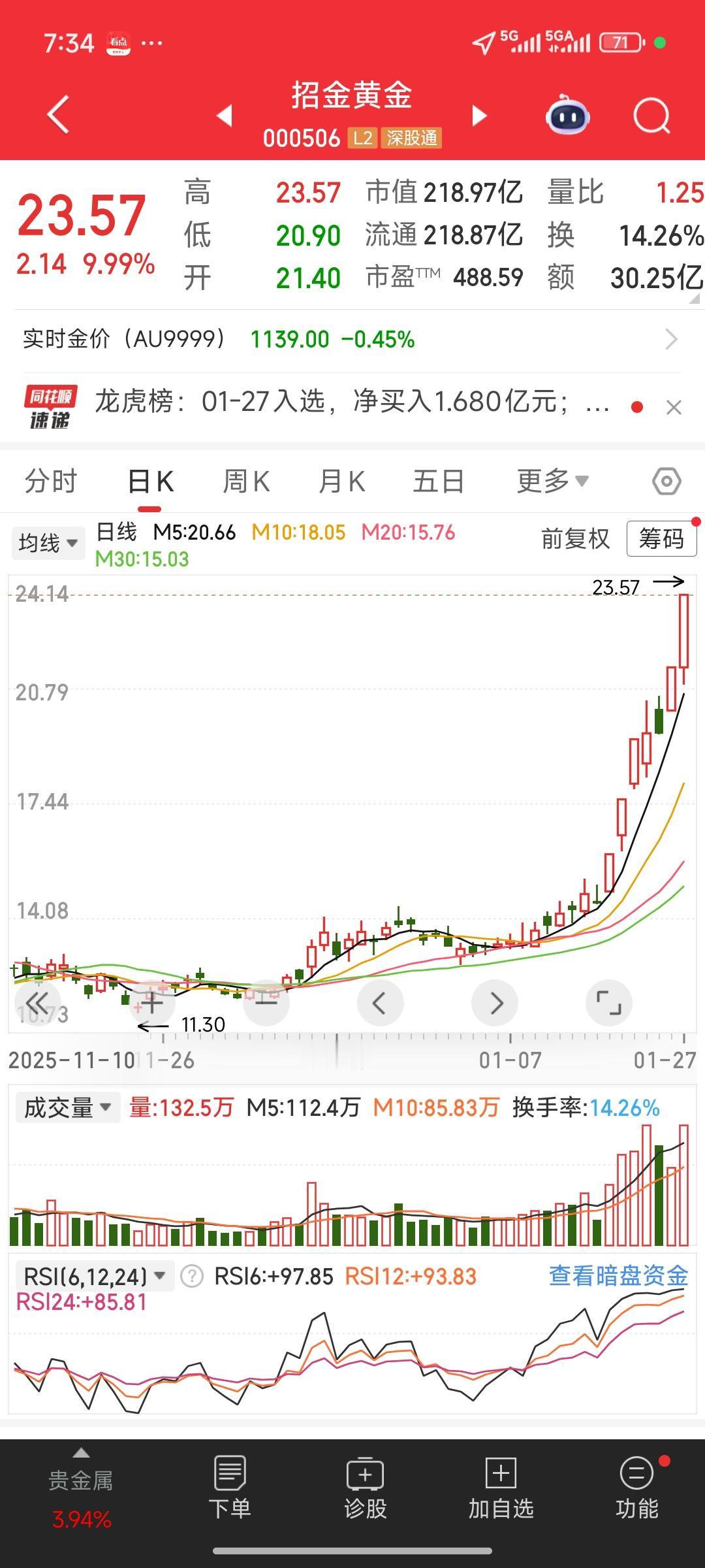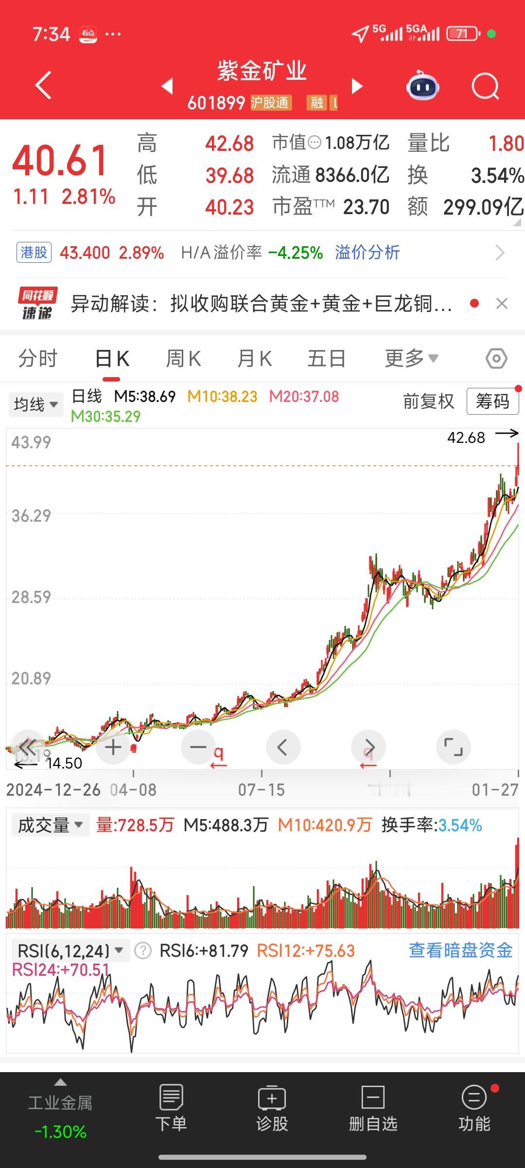 随着黄金价格持续攀升,黄金相关概念股票终于迎来主升浪。绝大部分股票在短短几个交易日内就大幅上涨。尤其是紫金矿业,我一直十分看好,一直等着它回调,却始终没找到买入时机,只能眼睁睁看着它一路上涨,悔得直拍大腿。 黄金