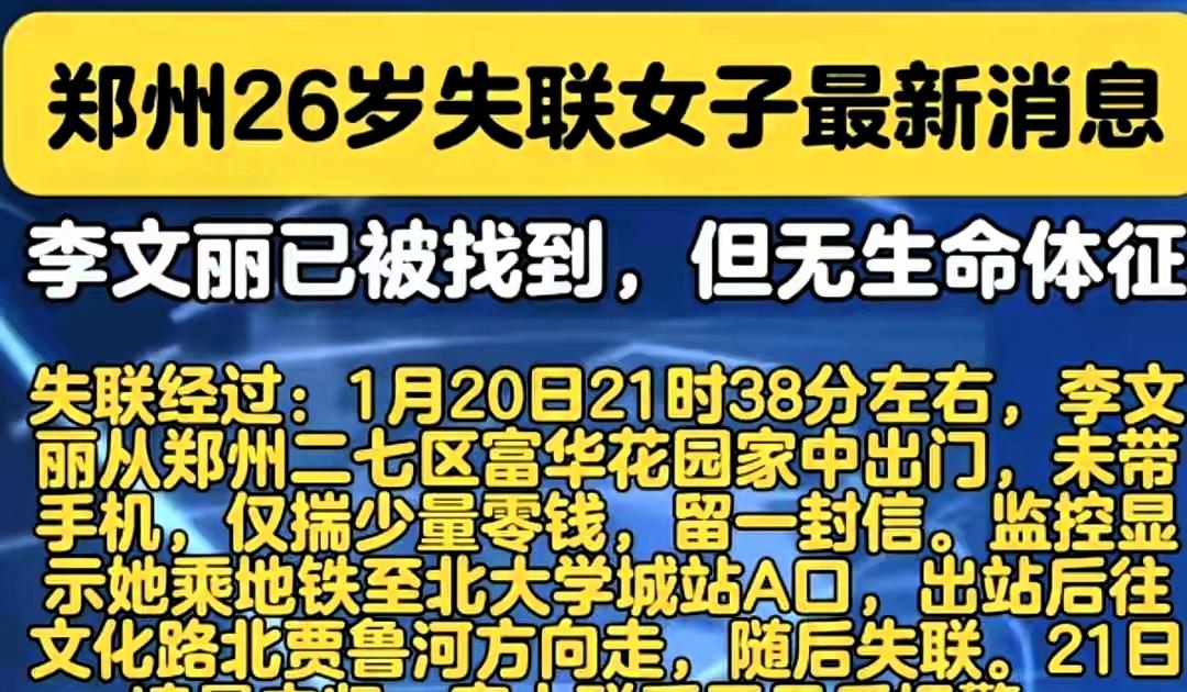 郑州李文丽失联6天有结果:1月25日下午3点打捞出遗体,曾留封信 1月20日