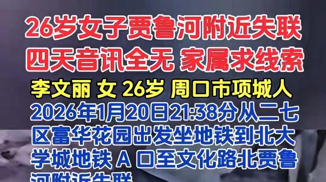 郑州李文丽失联6天有结果:1月25日下午3点打捞出遗体,曾留封信 1月20日晚上9点38分,她穿着白上衣黑裤子、踩着白靴子出门,手里拿着一本书,身上只装了点零钱,手机直接留在了家里。同住的哥哥以为她像往常一样去上夜班,没多问,谁能想到,这竟是兄妹俩的最后一面。 到21日凌晨,哥哥等到天快亮也没见妹妹回家,这才察觉不对劲,赶紧报警。民警调取监控后发现,李文丽从家附近坐上地铁,换乘一次后在北大学城站A口出站,随后沿着文化路往北走,目标方向正是贾鲁河,这段路步行也就五六百米。 监控里,她一个人慢慢走着,之后就再也没有了踪影。哥哥立刻带着妹妹的朋友赶到河边搜寻,当地救援队和志愿者也很快加入,大家把沿岸的草丛、树下、桥洞都翻了个遍,不放过任何一个角落。 这6天里,哥哥几乎没合过眼,整个人憔悴不堪,眼睛熬得通红。他说,妹妹近期情绪不太好,有抑郁的迹象,还在家里留了一封信,只是他不方便透露内容,言语间满是自责,觉得自己没照顾好妹妹。 1月25日下午3点,郑州雷霆救援队在贾鲁河里打捞出一具遗体,后续确认正是李文丽。一个26岁的姑娘,在大城市里靠着夜班工作努力生活,平时性格温和,和身边人相处也没矛盾,谁能料到会发生这样的事。 其实抑郁从不是“矫情”,它就像一场无声的感冒,需要身边人的重视和关心。我们总以为日子还长,却忘了有些人的崩溃,往往只在一瞬间。多留意身边人的情绪变化,别让“忙”和“粗心”,成为一辈子的遗憾。