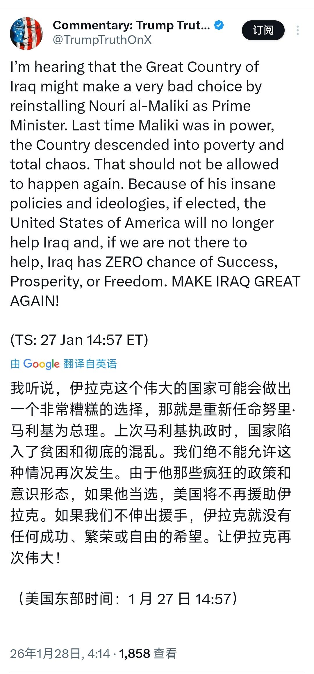 一边撤军示好,一边威胁断援——美国对伊拉克的"双面游戏"。特朗普刚刚在社交媒体发出一份措辞严厉的声明,直指伊拉克即将做出"一个非常糟糕的选择"。他点名努里·马利基,称如果这位前总理重新执政,美国将完全切断对伊拉克的援助。声明最后还来了一句标志性的口号:"让伊拉克再次伟大!" 这番表态之所以令人侧目,恰恰因为时机太过微妙。就在十天前,伊拉克刚刚宣布全面接管阿萨德空军基地,标志着美国主导的国际反恐联军完成了从伊拉克政府控制区的全部撤离。二十多年前靠战争入侵的美军,如今被请了出去。而就在伊拉克国民议会准备按宪法程序选举新总理的节骨眼上,特朗普的"指示"却不期而至。 马利基何许人也?这位什叶派政治家2006年至2014年连续两届出任伊拉克总理,是伊拉克战后政治史上在位时间较长的领导人之一。 本月24日,伊拉克国民议会最大党团"协调框架联盟"经多数表决,正式提名马利基为新任总理人选。根据伊拉克宪法,新一届议会需在首次会议召开后30天内选出新总统,新总统随后将指派议会最大党团推出的人选出任总理。换句话说,马利基距离第三次入主总理府,只差临门一脚。 而特朗普对马利基的敌意,由来已久且有据可查。2014年,正是在马利基执政末期,极端组织"伊斯兰国"在伊拉克北部迅速崛起,一度攻占第二大城市摩苏尔。 当时奥巴马政府公开表示对马利基失去信心,认为这位什叶派领导人无法与逊尼派和解,其边缘化逊尼派的政策被批评为导致部分民众转而支持极端武装的原因之一。美国官员曾明确表态,希望伊拉克政党能组建一个"没有马利基参与的新政府"。最终,在内外压力下,马利基于2014年8月黯然下台。 十年过去,风水轮流转。如今的伊拉克政治版图已发生深刻变化。去年11月举行的国民议会选举中,现任总理苏达尼领导的"重建与发展联盟"获得46个议席位居首位,而马利基领导的"法治国家联盟"也斩获29席。两大势力同属"协调框架联盟"这一什叶派政治联合体,在议会中握有主导权。 选举结果反映出伊拉克民众对稳定治理与持续发展的期待——过去两三年间,苏达尼政府在安全和经济领域取得的进展有目共睹,而"协调框架联盟"的整合则确保了什叶派政治力量的相对团结。 但马利基的回归并非板上钉钉。伊拉克政坛从来不缺变数。按照惯例,总理人选需要在什叶派、逊尼派和库尔德三方之间达成微妙平衡,任何一方的强烈反对都可能让组阁进程陷入僵局。2022年苏达尼组阁时,正是经历了长达一年的政治拉锯才最终上任。而这一次,美国的公开施压无疑给本就复杂的博弈增添了新的外部变量。 特朗普的威胁是否管用?这个问题本身就颇具讽刺意味。就在他发出这份声明的前十天,美军刚刚从伊拉克政府控制区完成了撤离。伊拉克高级军事委员会的声明明确表示,伊军目前已"完全具备能力"防止极端组织死灰复燃,不再需要外国军队保护。换句话说,美国手中的军事筹码正在缩水。 更耐人寻味的是援助这张牌。美国对伊拉克的援助长期以来主要体现在军事培训、情报分享和反恐合作等领域。但随着撤军完成,这些合作的规模和重要性已大不如前。反倒是伊拉克坐拥丰富的石油资源,日产量维持在400万桶以上,通过出口赚取的收入足以支撑政府运转。马利基执政时期,就曾被指对美国施加的金融压力"免疫",只要南部港口正常运作,巴格达便能保持经济上的宽裕。 当然,特朗普这番表态的真正意图,恐怕不只是针对马利基个人。在中东棋局上,马利基被视为与伊朗关系密切的政治人物,其领导的政治力量属于亲伊朗的什叶派阵营。 对于正在中东推行强硬政策的特朗普政府而言,一个被认为倾向德黑兰的伊拉克总理,显然不是他们乐见的结果。从这个角度看,这份声明与其说是对马利基的"警告",不如说是对整个"协调框架联盟"的敲打——别忘了美国的态度。 问题在于,伊拉克政坛对这种外部干预的容忍度正在下降。2020年,美军空袭巴格达炸死伊朗高级将领苏莱曼尼后,伊拉克国民议会就曾通过决议要求外国军队撤离。此后数年间,伊拉克什叶派民兵武装与美军之间的冲突时有发生,反美情绪在民间持续升温。当越来越多伊拉克人呼吁外国势力彻底退出国土时,来自华盛顿的公开指令,恐怕只会适得其反。 去年底至今年初,伊拉克局势的演变已经清晰传递出一个信号:这个饱经战火的国家正在努力摆脱"治乱循环",走向自主发展的轨道。新一届议会选举的顺利完成、美军从政府控制区的撤离、以及伊拉克政府在安全和民生领域持续施力,都指向同一个方向——伊拉克人希望掌握自己的命运。 在这样的背景下,特朗普的这份"通牒"能产生多大效果,答案其实已经写在风中。真正的悬念在于:如果马利基最终入主总理府,美伊关系将走向何方?而华盛顿又将如何在一个不再听命于己的中东国家面前,维护那日渐稀薄的"影响力"?