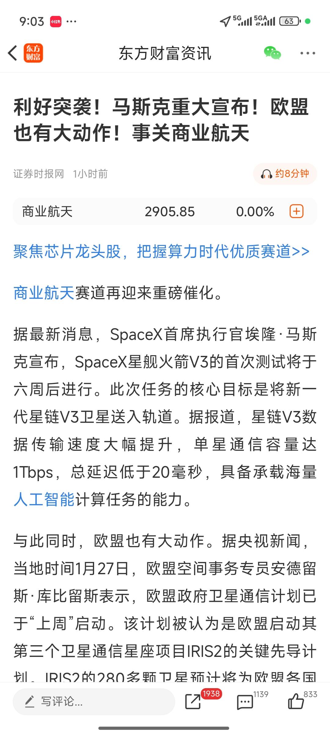 卫星、商业航天、航空航天信息持续催化。新年伊始,马斯克在商业航空航天领域又有新动作。与此同时,欧洲也打算加码商业航天。我认为,商业航天、航空航天领域今年的发展逻辑始终存在,长期持有相关投资应该问题不大,当然,把握好节奏或许能获得更多收益。 中国商业航天 马斯克经济预测 马斯克星链卫星 商业与航天 马斯克经济 航天经济 航天产业