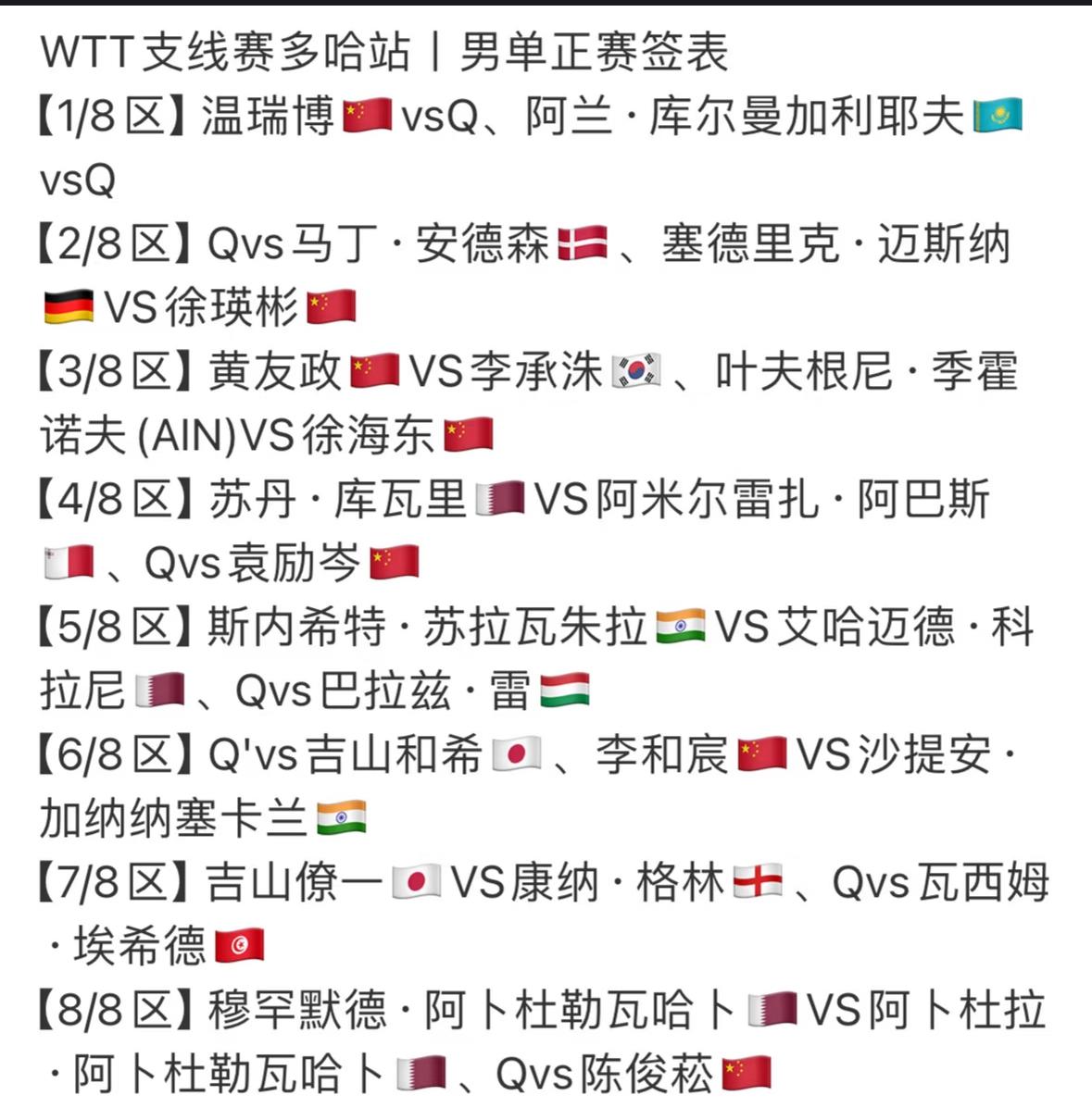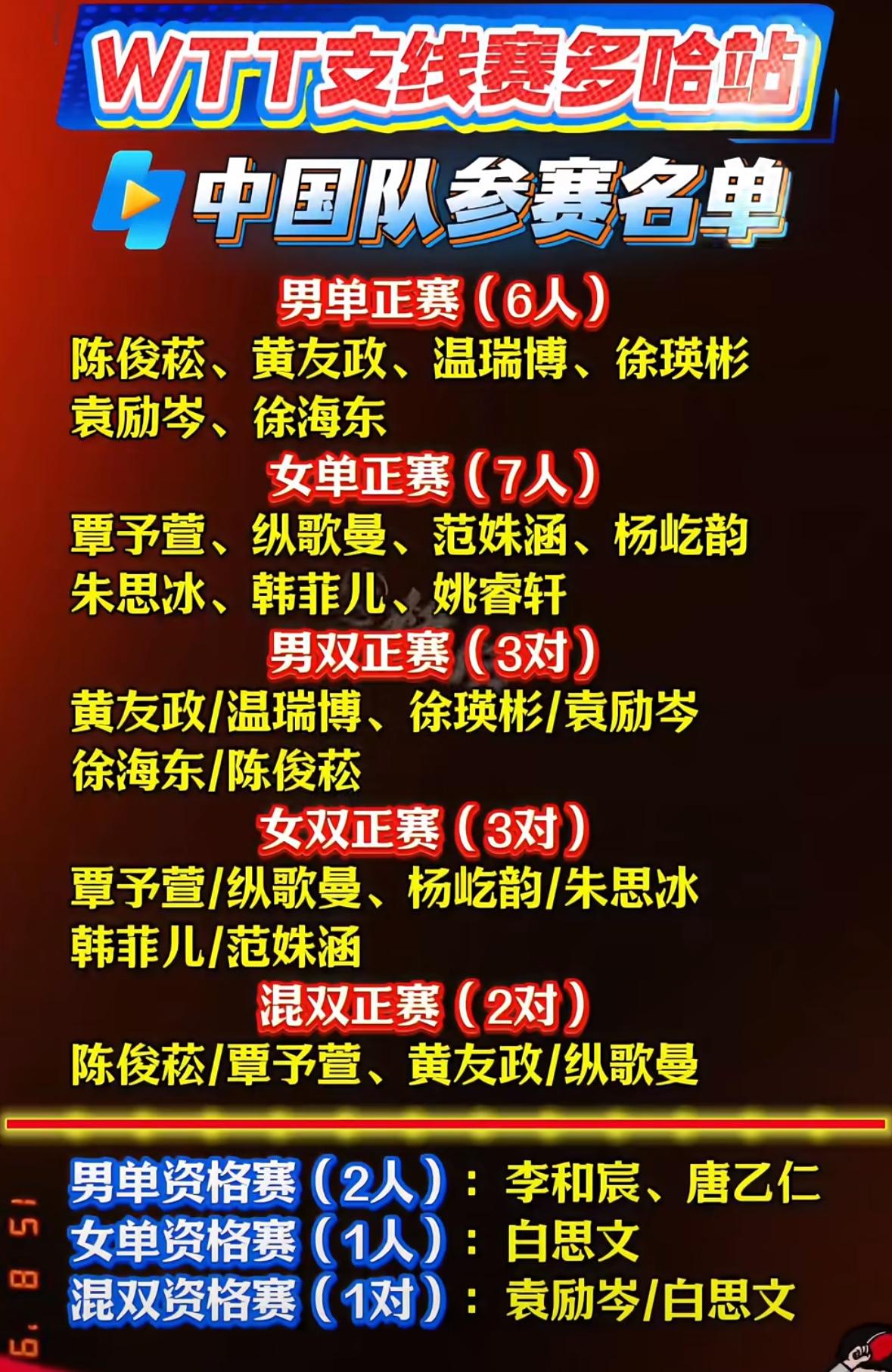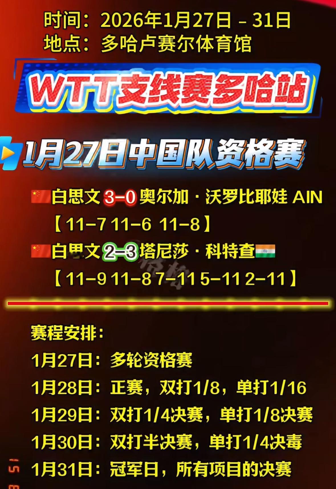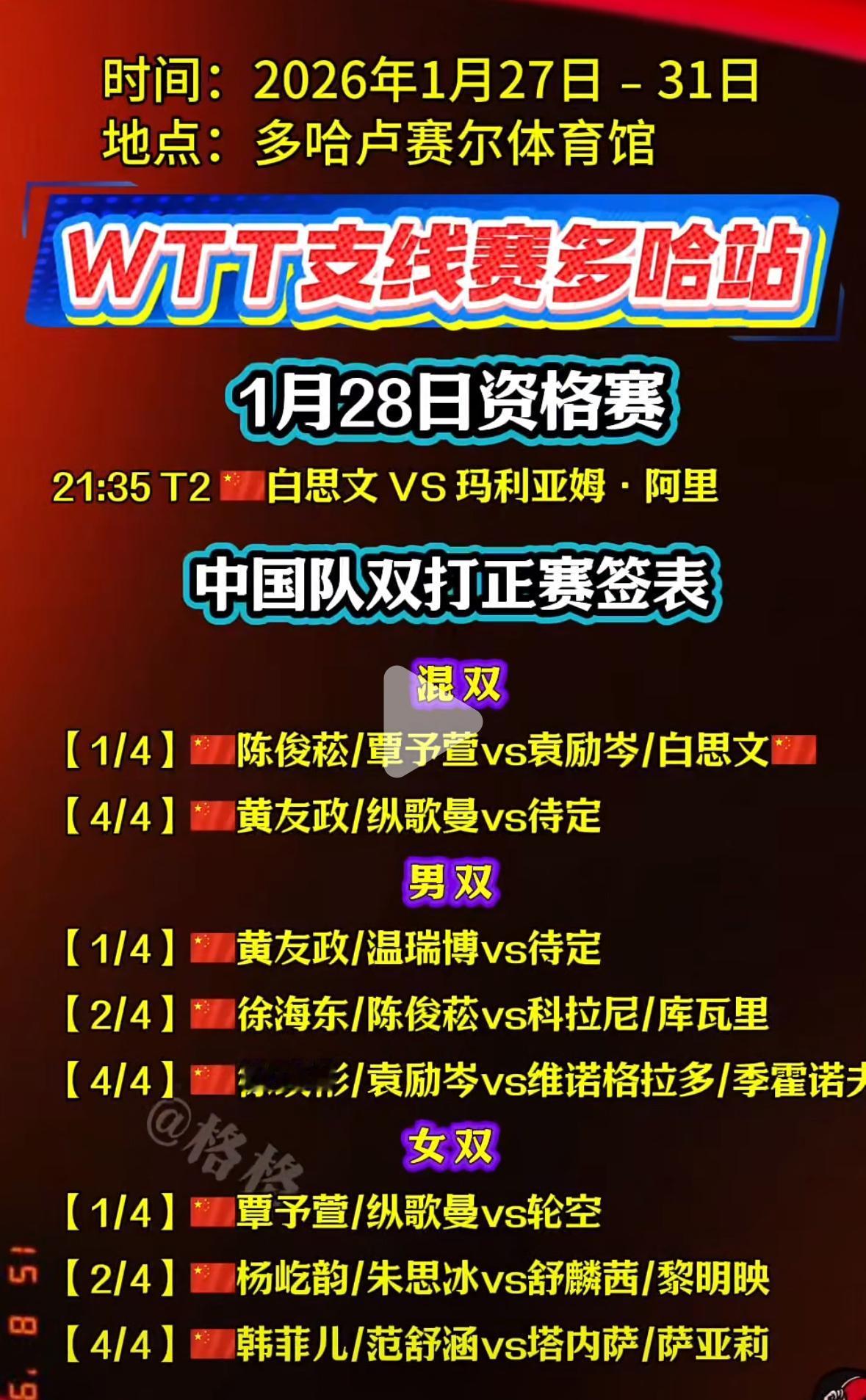 WTT支线赛多哈站1月28日赛程 陈俊菘/覃予宣VS袁励岑/白思文 2026WTT支线赛混双第一场 就是内战, 陈俊菘/覃予宣VS袁励岑/白思文, 黄友政在这次比赛中又是 身兼三项, 黄友政/纵歌曼打混双, 黄友政/温瑞博打男双, 男单正赛签表已经出来了, 上半区非常拥挤, 温瑞博,徐瑛彬,黄友政, 袁励岑,徐海东都在上半区, 下半区有陈俊菘和李和宸坚守, 支线赛就是锻炼小队员, 给他们更多的实战机会和体验, 希望温瑞博 陈俊菘这两名 新闯出来新生代小将能稳定发挥, 会师决赛!