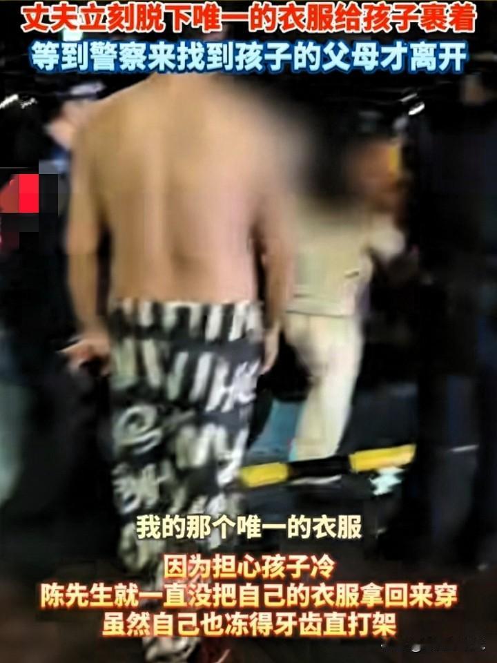 凌晨一点多的贵州,男子开车回家。寒夜里,街上一个小男孩的哭声吸引了他。男子靠边停车,接下来一个举动,让人感动不已。 那天是妻子的生日,贵州遵义的陈先生带着妻子出去吃夜宵。 吃完夜宵回来的路上,突然发现街边有一个小男孩在哭喊。 冬天的凌晨,室外气温很低,只有1度。 这是谁家的孩子?在这样冷的天气,这么晚的晚上一个人跑出来,多不安全啊。 陈先生一边心里疑惑着,一边把车慢慢靠边停下。 拉开车门,穿着长款毛绒睡衣的陈先生,从开着空调的车里抬腿下车 ,一阵寒气扑来,不由自主的打了个冷颤。 陈先生疾步走向哭泣的小男孩,当他目光落在孩子身上的时候,真的又是气愤又是心疼。 小男孩仅穿着一件夏天的短袖睡衣,光着屁股,脚踏一双凉鞋,已经冻的皮肤发紫,身子抖个不停,嘴里还发出牙齿碰撞产生的磕磕磕的声音。 陈先生见状,没多想连忙脱掉自己穿着的睡衣,手脚忙乱地裹住男孩冰冷的身子。 坐在车子里的妻子看到,也急忙下了车,把孩子抱起来,带到车子里暖和暖和。 妻子非常有耐心地把孩子抱在怀里,给他裹紧衣服,又安抚地轻轻拍着孩子的背。 陈先生问孩子,为什么一个人在街上走,爸爸妈妈去哪儿了,家在哪里? 可是,估计孩子年纪小,一个人在街上受冻又害怕,一下子缓不过来神。 小小的他只知道哭,对陈先生问的话,一个都不回答。 沟通不下去,没办法,陈先生掏出手机报警,然后和妻子带着孩子在车里等民警。 民警赶到后,陈先生要配合做笔录,协助调查。 因为唯一的上衣给了孩子裹在身上取暖,陈先生只好裸着上身从车里出来,紧紧抱着双臂还冻的发抖。 后来,在民警的协调下,终于联系上男孩的家长,孩子妈一个人过来接孩子。 孩子妈临走时,对陈先生感激了又感激;民警也称赞了陈先生夫妇的善良和热心。 事后,陈先生说,如果那天,不是他发现了男孩,并且及时给了帮助,他真的无法想象,小男孩最后会变成怎样? 因为天那么冷,又那么晚,街上车子少,行人更加少,如果男孩一直没有被发现,他该多害怕,多绝望。 那个晚上,陈先生的出现,对于小男孩来说,就是上天派给他的天使,给他温暖,护他平安。 其实,陈先生救的又何止小男孩一个人,他是挽救了小男孩一家。 生活中,像陈先生这样大爱的人有很多。 他们总是在别人无助或落难的时候,毫不犹豫地伸出援助之手; 他们的善良,在温暖着别人的时候,也在默默影响着身边同样友善的大家。 不做冷漠的路人,愿做身边的微光。 陈先生脱下的是一件睡衣,扛起的是一份旁人有难必帮的担当; 他冻得发抖的身影,暖的是一座城的心。 这世上哪有那么多从天而降的英雄,不过是普通人在关键时刻,愿意挺身而出罢了。 愿我们都能接住这份温暖,把善意传下去,让身边的人,都能遇见这样的温柔与美好。