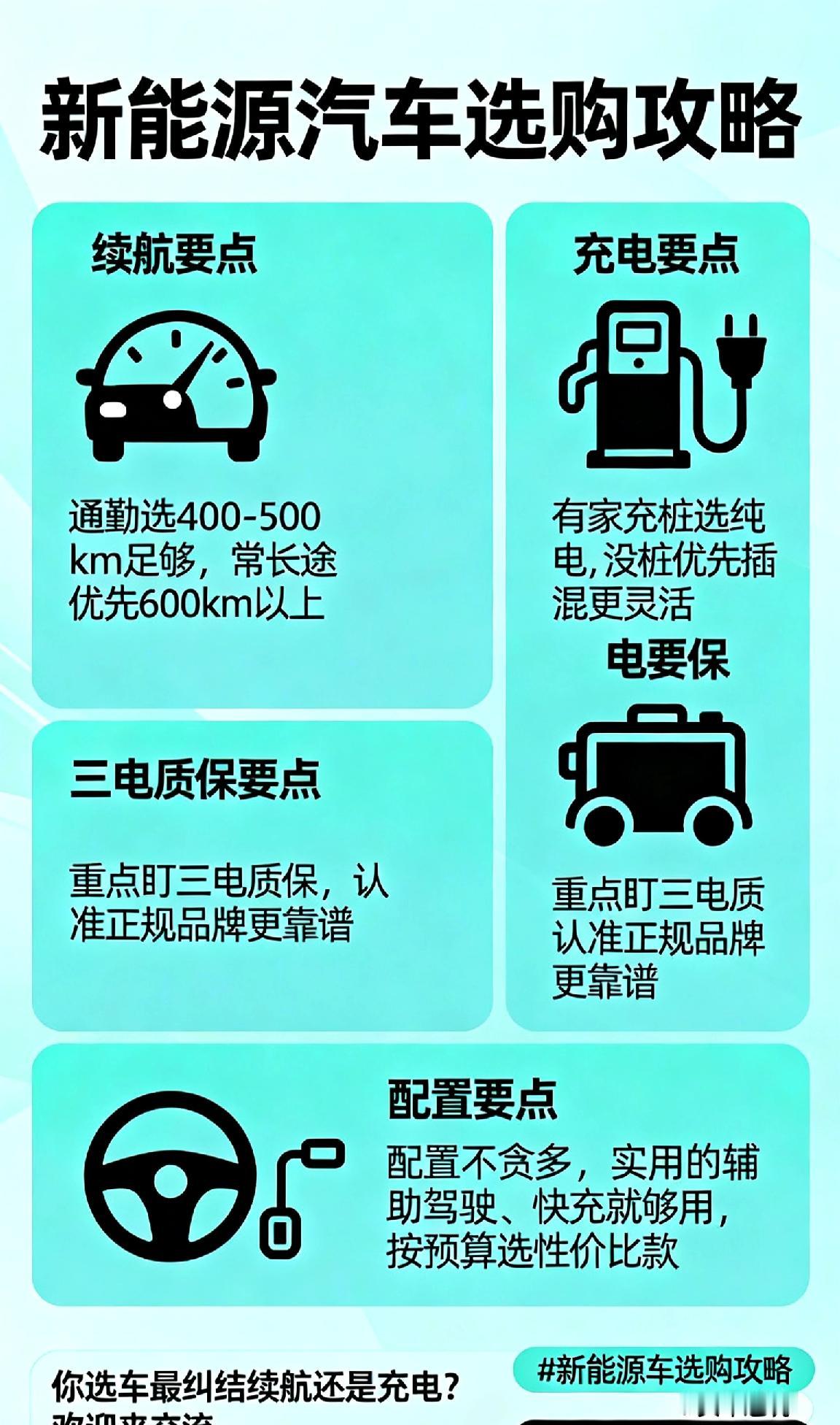 新能源汽车这么多,到底该怎么选选新能源汽车不踩坑,抓住这几点就够!先看续航,通勤选400-500km足够,常长途优先600km以上;再看充电,有家充桩选纯电,没桩优先插混更灵活;重点盯三电质保,认准正规品牌更靠谱;配置不贪多,实用的辅助驾驶、快充就够用,按预算选性价比款。你选车最纠结续航还是充电?欢迎来交流~ 新能源车选购攻略 买车避坑 用车指南 汽车干