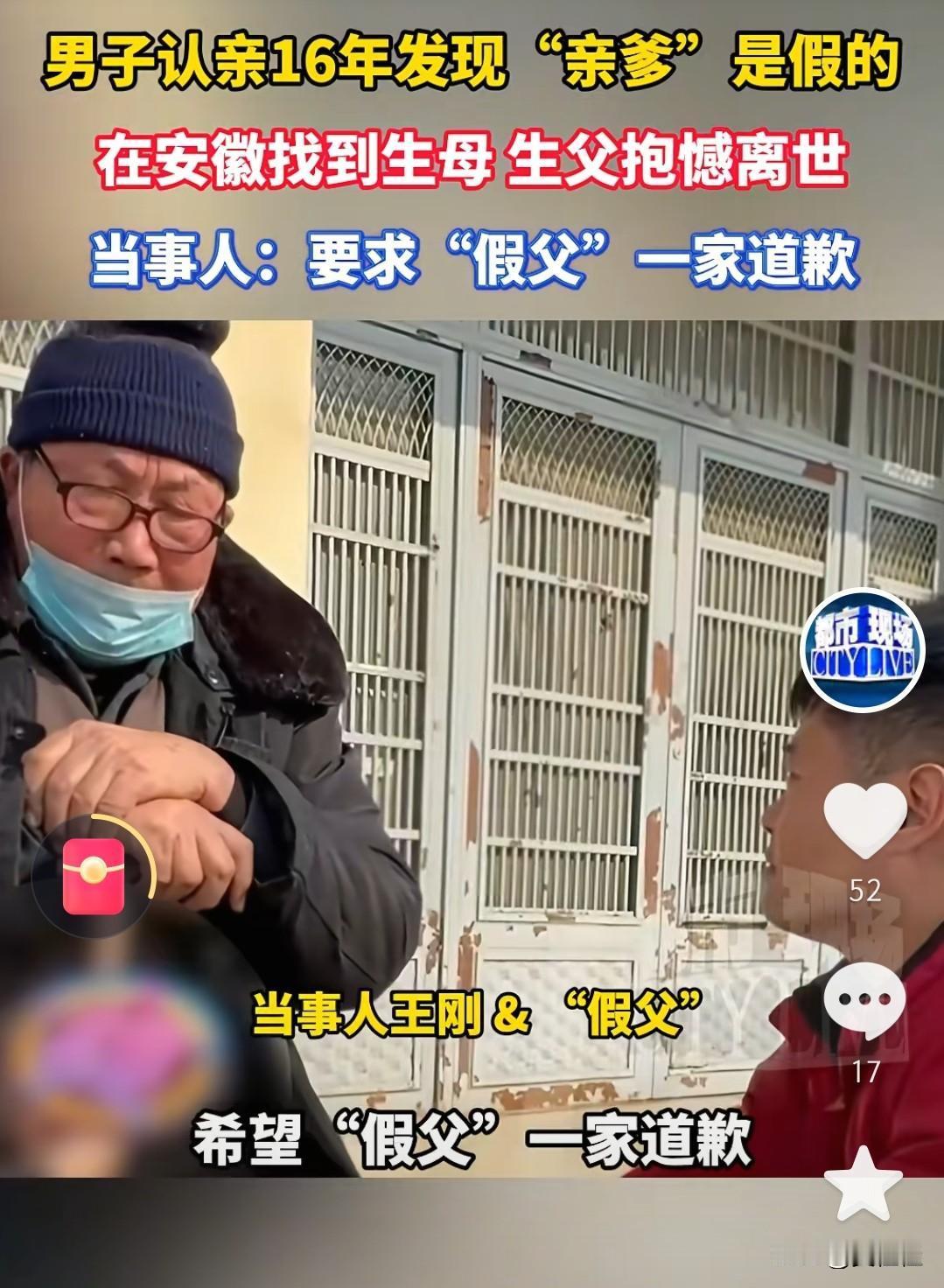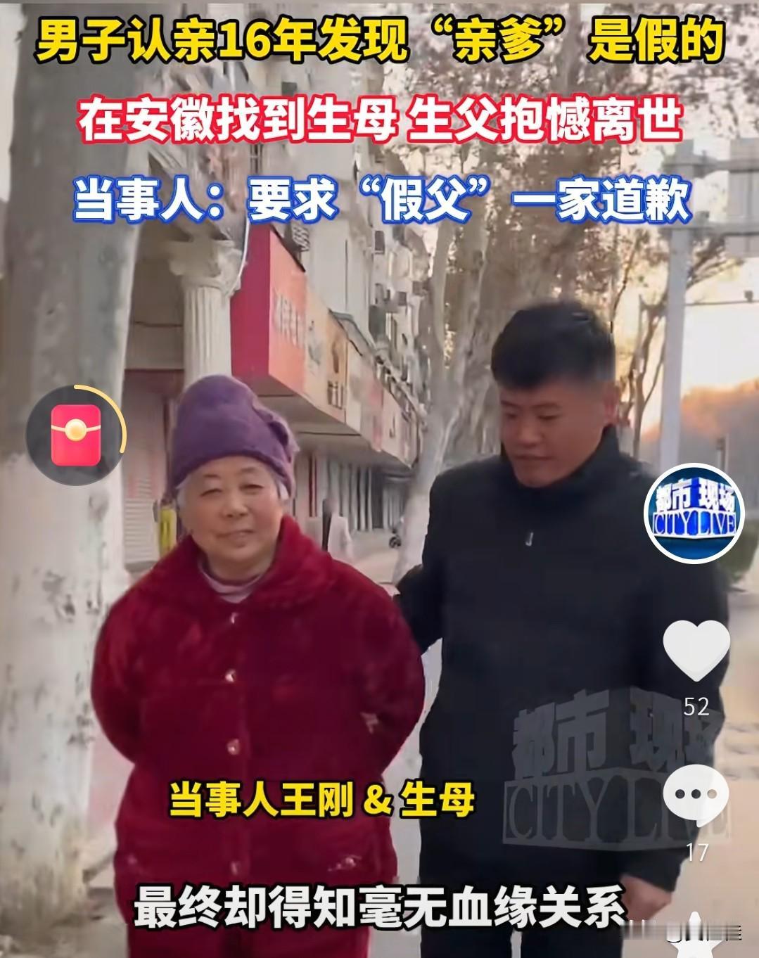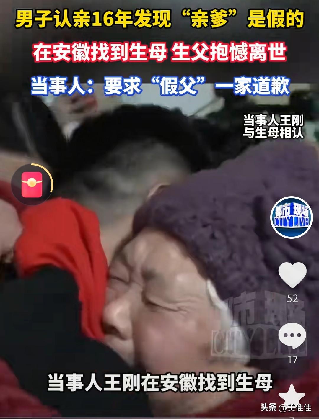 “亲爹”突然变成“”假父”,到底怎么回事?当事人王刚直到2025年才找到亲生母亲,可这背后的事儿更让人揪心。他早在16年前就经历了一场认亲,本以为终于找到了血脉至亲的父亲,这些年一直以父子相称,满心都是团圆的欢喜,谁曾想时隔16年,才发现两人压根没有血缘关系,这场认亲从一开始就是一场误会。 更让人遗憾的是,他的亲生父亲早已离世,王刚彻底错过了和亲生父亲相见的机会,连最后一面都没赶上。 我很疑惑,16年前认亲的时候怎么不做亲子鉴定?查询得知,那会儿大家都凭着外貌、口述的线索认亲,觉得对上了就是一家人,根本没想着要做科学鉴定,谁能料到一时的疏忽,竟留下了一辈子的遗憾。