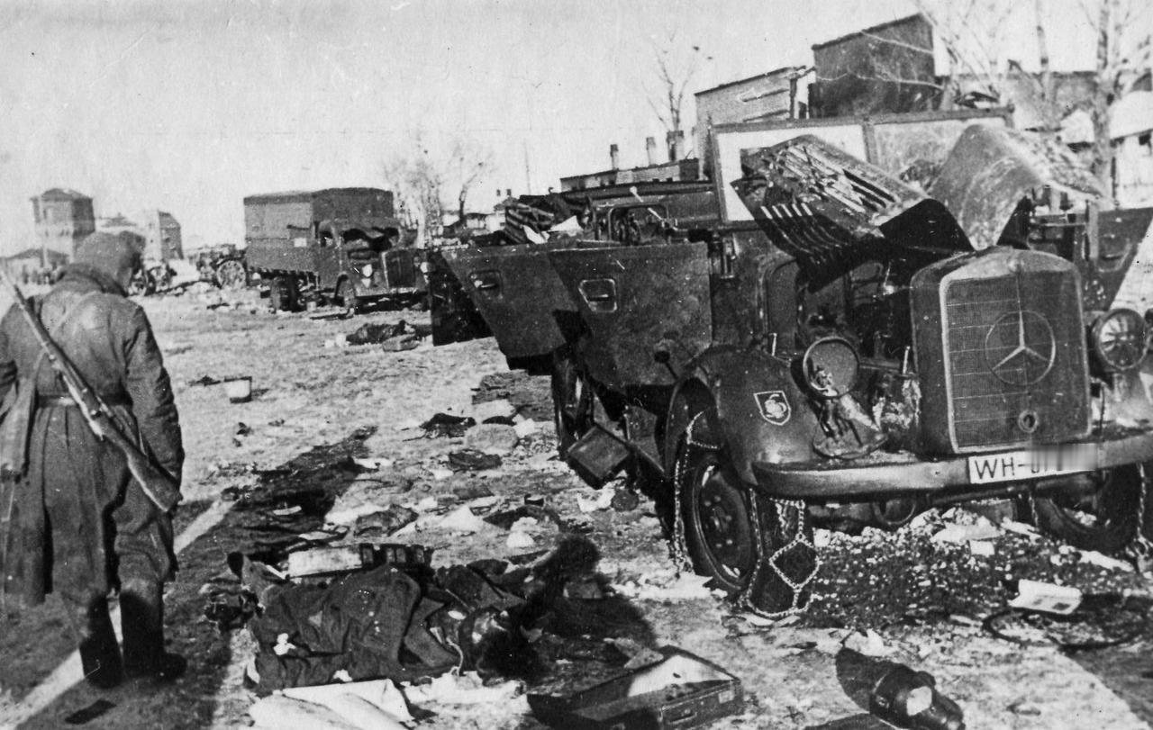 本来就没多少,再打就没了——1943 年,东线,沃罗涅日州,卡斯托尔诺耶。一名苏军战士查看被击毁的德军运输车队,身旁是阵亡的德军士兵。画面前景为一辆梅赛德斯 - 奔驰 L1500 A 军用卡车,远景可见欧宝 “闪电” 军用卡车。 当时正值卡斯托尔诺耶战役(1943.1.13-2.18),该战役是斯大林格勒战役侧翼重要作战,沃罗涅日方面军发起围歼战,歼灭德军第 2 集团军主力及意大利、匈牙利仆从军,收复卡斯托尔诺耶等关键据点,是 1943 年苏军冬季反攻的重要战果。 梅赛德斯 - 奔驰 L1500 A (参见图2)是德军二战中期主力1.5 吨级轻型军用卡车,1940 年开始量产,采用 4×2 驱动,主要用于前线人员、轻武器 / 弹药短途运输,车身轻便、机动性适配东线复杂地形。 欧宝 “闪电”(Opel Blitz,参见图3)是德军二战核心军用卡车(3 吨级),1930 年代末量产,4×2/4×4 驱动版本均有,兼顾前线运输、牵引车、改装为防空 / 通讯车等多用途,产量超 10 万辆,是德军东线后勤运输的 “主力车型”。 与大家想象的不同,二战期间德国的汽车产量其实并不多,除了铁路,主要还是依靠骡马畜力运输。而东线残酷的战斗中损失了大量卡车,导致德军的后勤补给更加雪上加霜。
