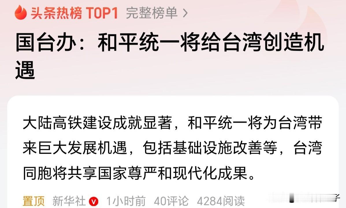 这个宣传方式有问题呀,天天宣传“统一”对台湾有哪些好处,台湾人是没有任何感觉的。 你们这样天天把台湾人当宝贝一样哄着、供着,鬼才愿意统一呢。 从古至今,中国一次一次的完成国家统一,世界各国也有完成统一的案例,没有一个是靠让利完成统一的。 即便是最和平的东德和西德的统一,也是因为东德穷的和鬼一样,东德人才有动力和西德统一。 你们现在把台湾人养的白白胖胖、脑满肠肥,人家为啥要和你统一?