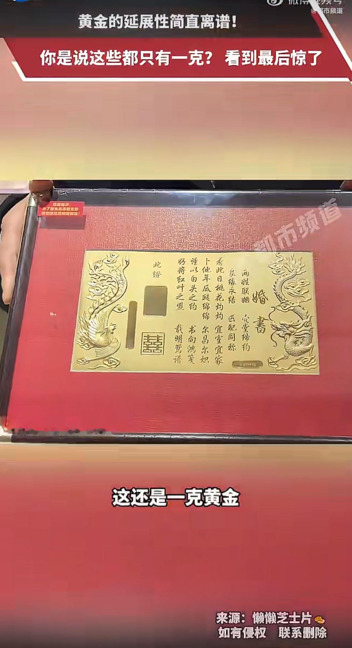 最近备婚圈里火得一塌糊涂的,当属那1克黄金做的婚书了。可能有人不信,一粒绿豆那么重的黄金,怎么就能变成一张能刻字的完整婚书?其实这全靠黄金天生的好本事——它的延展性在金属里是顶尖的,原子结构特殊,能像叠纸牌似的层层滑动却不断裂。再加上现代工艺的加持,1克纯金能被压成0.12微米厚的金箔,比蝉翼还薄三十倍,面积足够做出一张A4大小的婚书,上面还能精雕细琢新人姓名、婚期和祝福的话,最后装在红盒子里,看着就特别有仪式感。 这种黄金婚书能爆火,说白了就是戳中了年轻人的心思。现在的新人早就不喜欢传统“三金”那种又重又贵的套路了,数据说90后婚庆花费比80后少了三成多,但对有意义的仪式感却愿意花钱。1克黄金婚书刚好卡在这个点上,既不用花大价钱,又能拿出手当结婚信物,比普通纸质婚书耐用,还带着“情比金坚”的好寓意,宣纸会黄、红绸会旧,可黄金婚书能一直保存着最初的承诺。而且它还能定制,加个指纹、换个纹样都行,完全符合年轻人追求个性的想法。 有人质疑这是智商税,说这么薄的金箔一磕就变形,含金量也可能不达标。不可否认,确实有不良商家在工艺上偷工减料,但咱们不能一棍子打死。这张轻薄的婚书,本质上是年轻人对婚姻的一种新态度——婚姻的价值从来不是用黄金克数衡量的。以前总觉得彩礼多、金器重才叫重视,可现在大家明白,真心过日子比啥都强。1克黄金虽轻,却承载着两个人对未来的期许,这种“轻量化仪式感”,反而让婚姻回归了本质。 更难得的是,这小小的婚书还让老手艺焕发了新生。制作时用到的锤揲、錾刻技艺,都是传承了上千年的非遗手艺,现在通过这种年轻人喜欢的形式走进生活,既让更多人了解了传统工艺,又给老手艺找到了新出路。其实不管是黄金婚书还是别的婚庆用品,核心都是那份心意。年轻人反感的不是仪式感,而是被物质绑架的仪式感。1克黄金婚书的流行,恰恰说明大家越来越清楚自己想要什么——不用攀比,不用铺张,一份简单却郑重的承诺,就足以开启一段幸福的婚姻。毕竟,能扛住柴米油盐的,从来不是黄金的重量,而是两个人相守的决心。 来源:都市频道