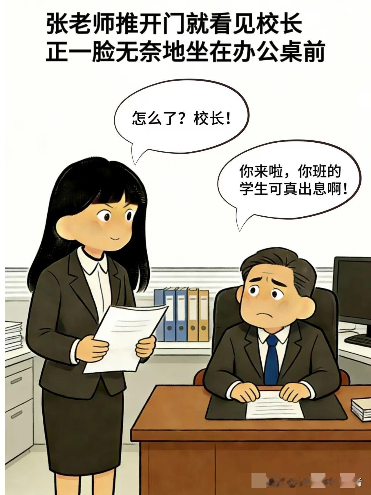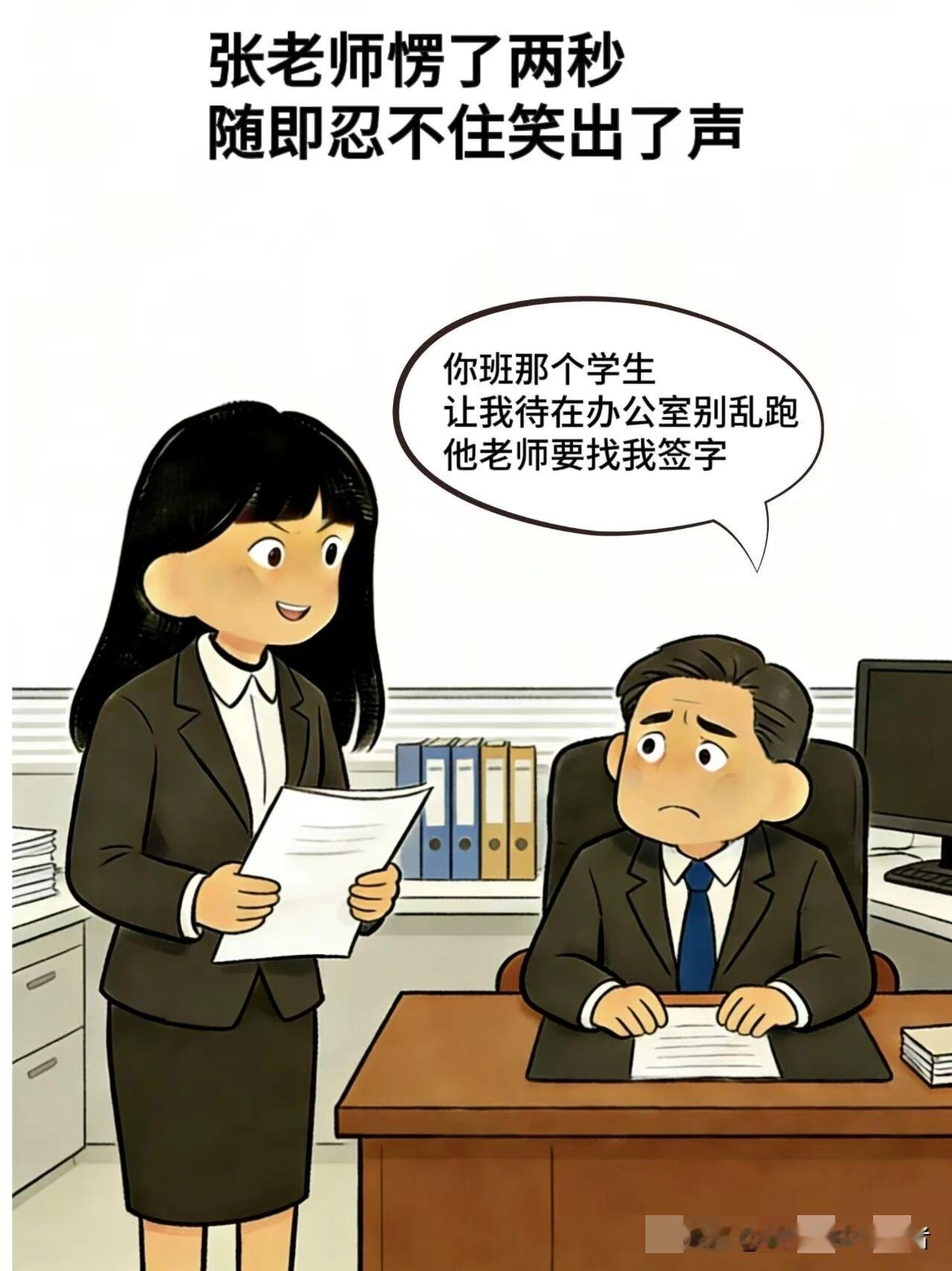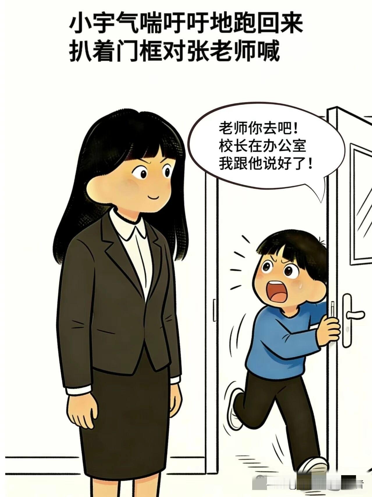 趣味漫画:张老师:小宇,你帮老师去看看校长在办公室?小宇:保证完成任务,没过几分钟,小宇:老师你去吧!校长在办公室,我跟他说好了
