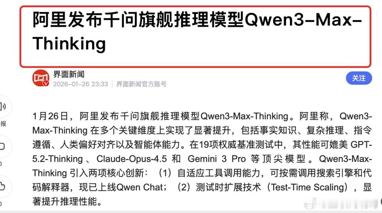 春节前夕,中国AI打出一张王牌:硅谷开始递“投名状”了就在农历新年前夕,科技圈传来一条振奋人心的消息:1月26日,阿里正式发布全新旗舰推理模型——Qwen3-Max-Thinking。这个大模型实力不一般,它的性能不仅能媲美GPT-5.2与Gemini3Pro,还刷新了国内模型性能纪录。这背后释放出两个关键信号:第一,中国AI不仅追上了,还走出了自己独特的路子。要知道,Qwen3-Max-Thinking是阿里在芯片、算力、云平台、模型架构和产业场景多年深耕的集大成者。它不是实验室里的炫技产物,而是在制造业、金融、物流等B端复杂场景中反复打磨出来的实战型AI。第二,千问大模型的能力,正在反向赋能C端产品,帮助普通人办事千问大模型在B端复杂场景中持续锤炼的推理与Agent能力,正在成为C段产品升级的重要支撑。以最新的千问App为例,它不再主打“陪你聊天”或“写段子”,而是聚焦一个核心理念:帮你办事。无论是订机票、查财报、做旅行攻略,还是生成周报、分析合同、规划学习路径,它通通能做到。冰冻三尺非一日之寒,阿里能有今天的技术实力,离不开阿里千问强大的开源生态。截至目前,阿里千问已开源超400个模型,覆盖从0.5B到480B的“全尺寸”,支持文本、视觉等“全模态”;全球开发者基于千问衍生出的模型超过20万个,累计下载量突破10亿次。这个生态展现出的实力,硅谷也不得不服,Meta、Google等巨头开始主动寻求合作,不少硅谷初创公司甚至直接将Qwen3集成进自家产品线。硅谷公司们积极送上投名状的背后,是当阿里用开源生态构建了10亿级用户入口,中国AI已不再追逐“国际标准”,而是定义新规则的事实。