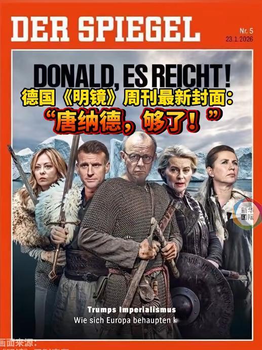 欧洲人确实受够了特朗普的欺负,已经开始学会表达不满了!最新一期德国《明镜》周刊发出图片,5位欧洲领导人手持武器,配文:“唐纳德,够了!”这5人分别为:德国总理默茨、法国总统马克龙、欧盟委员会主席冯德莱恩、丹麦首相弗雷泽里克森和意大利总理梅洛尼。他们身穿猎人服装,手持武器,背后是格陵兰岛冰川。从上述信息来看,因为格陵兰岛的问题,欧洲人空前的团结在了一起,就连冯德莱恩,梅洛尼这样的女人,对特朗普的行为都表示了愤怒。这张图片发出了强烈的信号,但凡美国想要强占格陵兰岛,欧洲人都不会放弃抵抗的。看来美国想要拿走格陵兰岛的事情,彻底激怒了欧洲。不出意外的话,美国的计划可能得改变了!