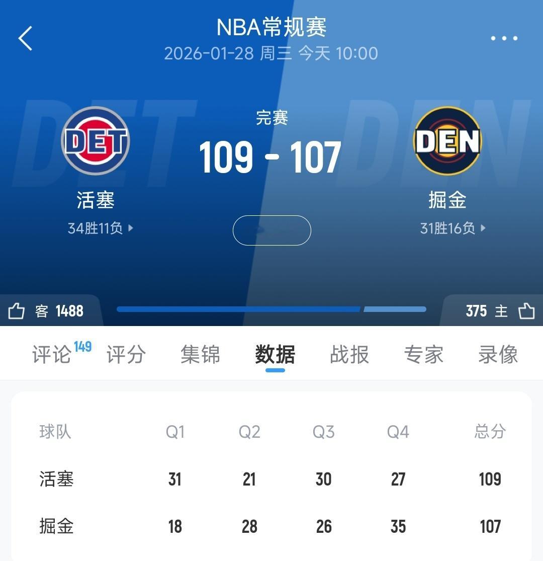 火箭冲击西部第二的机会来了!今日掘金主场107比109不敌活塞,给了火箭冲击西部