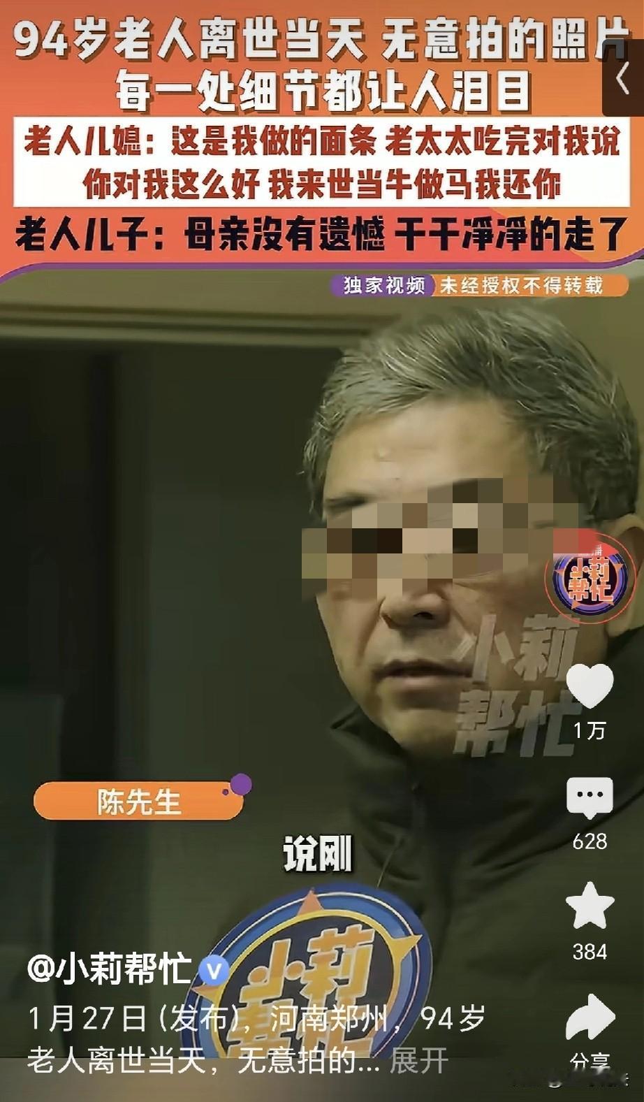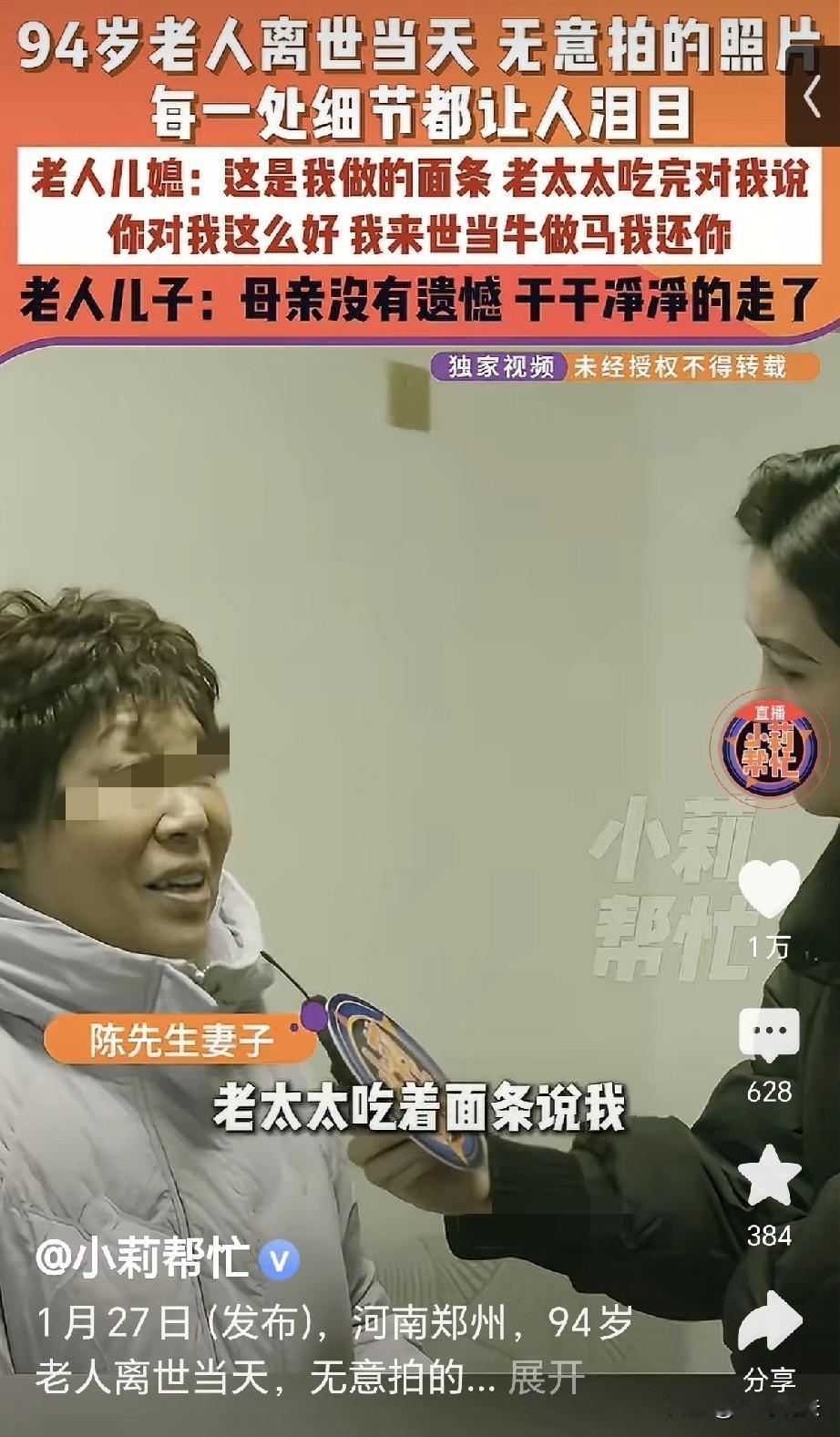 泪目!河南郑州,一女子给94岁的婆婆擀了碗细面,婆婆表吃边夸: 你对我这么好,我来世当牛做马我还你,媳妇以为婆婆开玩笑,顺手就给她拍了照片,婆婆吃完后又叫儿子: 刚,妈这一次是要走了,她要儿子给她换衣服理发,谁知到了晚上,老人去世,儿子泪如雨下,他这才知道,母亲是和自己告别,他当时无知,还埋怨母亲: 你走,你去哪呀? 陈先生的母亲是个善良的婆婆,她一生勤劳,把陈先生拉扯长大。 她给陈先生娶了媳妇,媳妇也是一位善良的女子,婆媳俩互敬互爱,就这样匆匆的几十年过去。 转眼间婆婆老去,她雪白的头发,依旧保持着年轻时的习惯,她从不多事,把自己拾掇的干干净净。 2021年元旦这天,婆婆已经94岁,她半靠在床上,儿媳给她擀了一碗细面。 那雪白的面丝,柔软细腻,再撒上几粒葱花,调的有滋有味。 儿媳给她端到床前,婆婆一口一口细嚼慢咽,她吃的热热乎乎,顿时感到生活是多么的幸福。 她年轻时的付出,此时此刻得到了回报,年轻时她对儿媳心疼体谅,到她老去,儿媳对她悉心的照料。 婆婆吃完面后,拉着儿媳的手不愿松开,她告诉儿媳,你对我这么好,我来世当牛做马还给你。 儿媳只当是婆婆开玩笑,她端过碗筷就到厨房拾掇。 她当时看着婆婆吃面,无意中给她拍下了照片,照片中的婆婆穿着大红棉袄,雪白的短发,端着细面,津津有味的吃着。 她全神贯注,仔细品尝每一根面,每一口汤,她干干净净,面容带着善良慈祥。 婆婆吃完面条,叫着儿子的小名: 刚,妈这一次是要走了。 陈先生以为她老糊涂,你走?你去哪呀? 谁知到了下午,婆婆告诉儿子,给我换换衣服吧,给我理理发。 儿子没有多想,给她穿的干干净净,万万没有想到,老人当天晚上就走了。 儿子回忆起白天母亲所说的话,他这才明白,母亲是在和自己道别那,她走的那么的突然,儿子瞬间泪如雨下。 多亏当时陈先生的妻子无意中拍下的照片,这张照片成了他们最美好的回忆。 那一刻的时光永远定格在一张薄薄的照片中,儿媳如今想起来婆婆,依旧是恋恋不舍,热泪盈眶。 儿媳擦着眼泪: 我婆婆是一个非常干净,勤劳善良的婆婆,她的离去真是太突然了。 看到陈先生妻子的讲述,一位网友分享了自己家情况,他说自己的爷爷93岁,是在农历二月十九日走的。 他走的那天,非让我爸爸给他理发,我爸爸说你头发又不长,刚理的没几天过几天再理吧,谁知爷爷急眼了,要知道我爷爷的脾气老好了,从来都不发火的。 我爸爸只有帮他理发,他还自己刮了胡子,到了晚上五点多钟,他就发烧难受,身上出了紫癜,开始意识不清了。 到了晚上11点16分,爷爷走了,他屋里的老挂钟也停在那个点上,原来我什么都不信,从那天起我信了! 又有一位朋友: 我奶奶走之前,我妈给她洗澡,她说你对我比几个女儿都好啊! 但是……并不耽误她把所有黄金首饰等财物分给她的女儿们,我妈毛都没有捞到一根!那就是血缘摆着,说几句好话是因为没有办法,女儿们不管她只能讨好媳妇,但是永远是女儿亲啊。 这位朋友说的情况确实存在,但是还有比金钱更贵重的东西,那就叫“福报”。 你母亲的善良积攒的福报,一定会以另一种形式回报到你们后辈身上。 有人说到,陈先生该有多么的幸福,有个这么善良的妻子,能把妈妈这样伺候走。 俗话说前十年看婆,后十年看媳,一定是婆婆关爱在先,媳妇儿也知道感恩,两好才能合一好那。 对此,你怎么看?