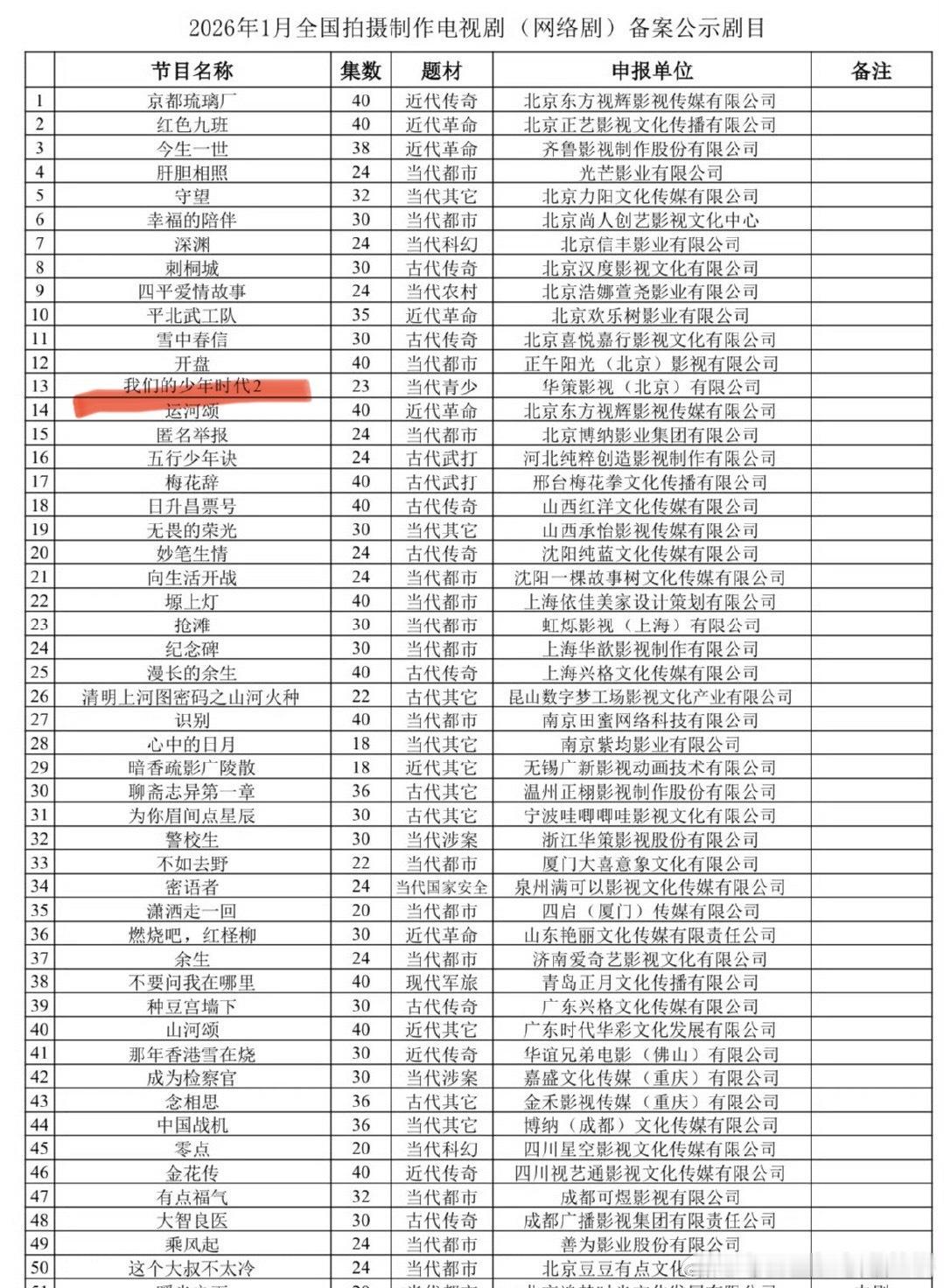 《我们的少年时代2》备案公示了共23集由华策影视出品