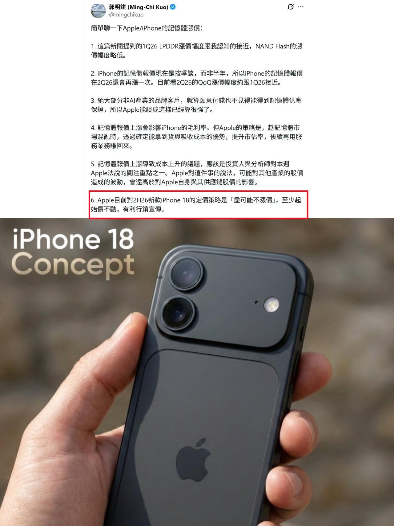 不关心苹果18涨不涨价,更关注iPhone Fold... 🤔才1月底,iPhone 18系列都爆料的差不多了... 听说还不涨价,那在如今存储内存涨价的今天是很大的优势,国产手机可能更难熬了...... - 不过我不是很关心,更关注传说中的iPhone Fold,听说外屏内屏都是 5.49-5.5 英寸,尺寸跟 iPad mini 差不多,液态金属铰链 + 实体拍照按键的设计直接梦回复古苹果味儿😓就是不知道苹果能不能推动折叠屏的软件适配?毕竟外观啥的都不是太重要,还说系统体验比较重要......你们说呢?