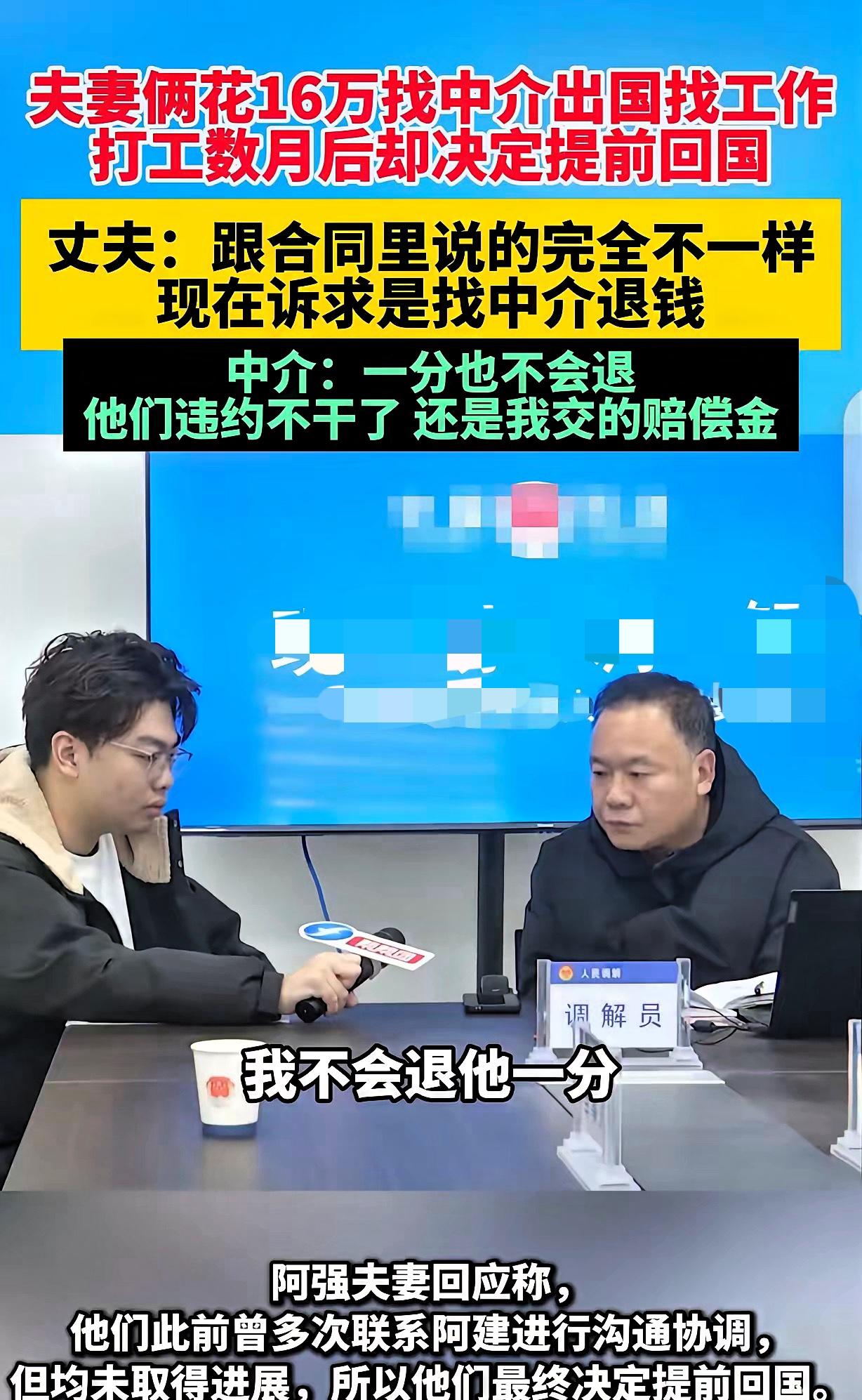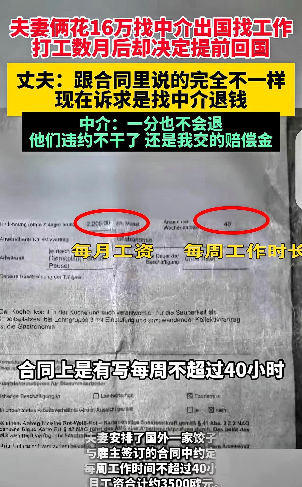 “肠子都悔青了!”福建,一对夫妻花16万中介费,去奥地利打工,两人月工资加起来有3500欧元,折合成人民币28000多元,每周工作时长不超过40小时,可到奥地利后,夫妻俩就傻眼了,因为现实与合同里约定的内容完全不符! 这对夫妻是福建三明的阿强两口子,家里有娃要养,还没买房,就想着出国拼几年多挣点。 经朋友介绍联系上中介阿峰,对方把奥地利的工作吹得天花乱坠,说饺子厂工作轻松,薪资稳定,俩人二话没说就每人交了8万,凑够16万中介费。 2025年5月,怀揣着发财梦的夫妻俩飞到奥地利,刚上工就傻了眼。 阿强被安排在饺子厂干杂活,早上7点就得进厂打包、装车,忙到晚上七八点才歇,中午连口气都没的喘,更别说休息了。 他老婆更惨,被分到饺子厂附属的餐馆,从早上8点忙到半夜12点,每天睡不了几个小时,累得站着都想打盹。 原本约定的每周不超过40小时工作,变成了每天十二三小时的连轴转,每周一天的休息也被直接取消,说好的加班费更是提都没提。 硬扛了7个月,夫妻俩实在顶不住,2025年12月就提前回国了,找中介要16万中介费,却被一口拒绝。 中介说自己已经办妥了出国手续,是夫妻俩没干满两年违约在先,还说他们把通勤时间算进了工作时长,根本不承认欺诈。 可夫妻俩压根没拿到过打卡记录,手里没实质证据,调解也只能暂时中止,好好的打工梦变成了维权难。 高薪出国打工的馅饼,大多裹着陷阱。别光盯着换算后的人民币数字,先核实中介有没有正规资质,合同条款是不是写得明明白白。 出门在外没证据寸步难行,真要去务工,每天的工作记录、沟通聊天都得留好,不然被骗了都没地说理,辛苦攒的血汗钱可就打了水漂。