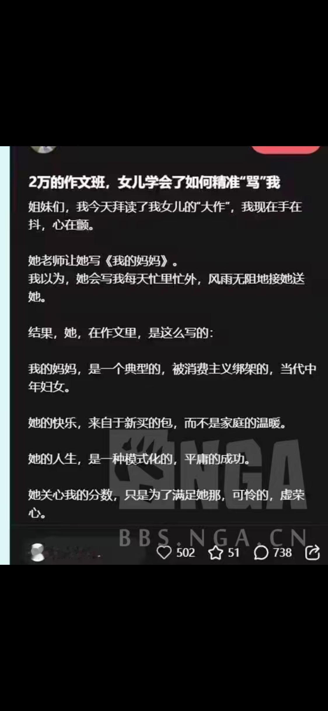现在的孩子怎么了,以前孩子写作文都是看到父母的不易,写的作文都是感恩父母的不易,像朱自清的《背影》莫言的《母亲》;现在的孩子写作文笔下是:我住在一个牢笼里,那里有一个生物学妈妈和一个生物学爸爸,妈妈是消费主义绑架的平庸的中年妇女,只关心她的分数,满足她那可怜的虚荣心[尬笑][捂脸]母亲的处境