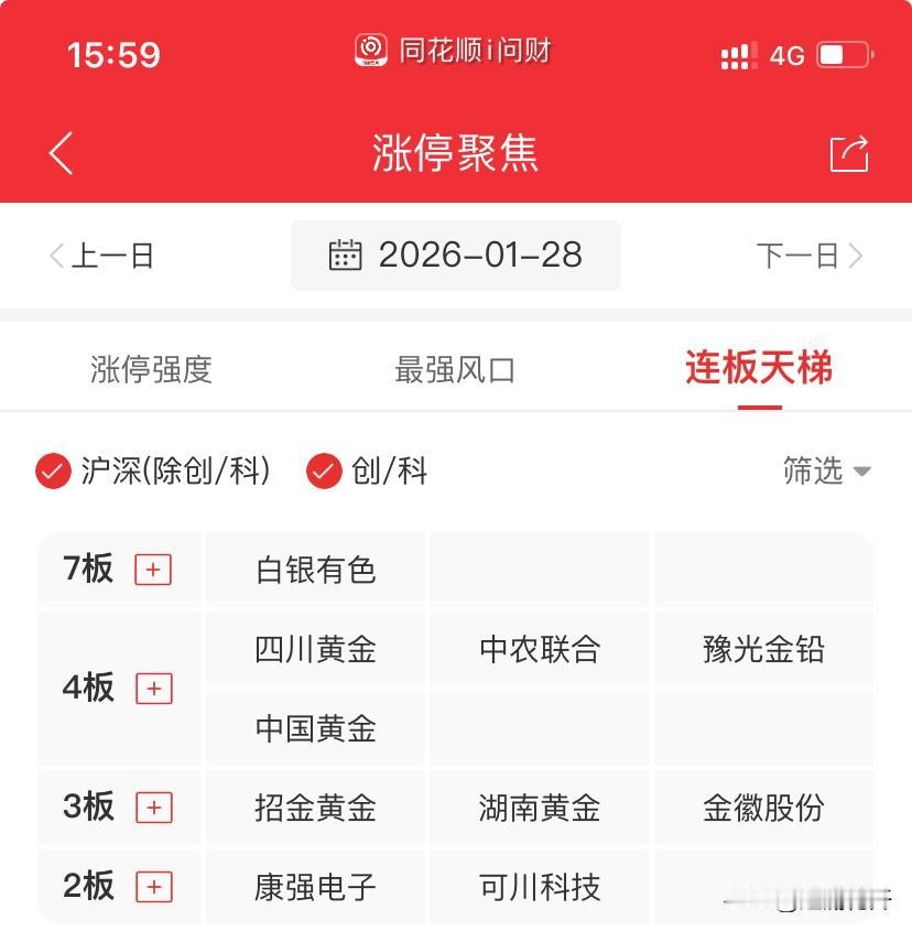 今天连板,还是说一下吧。咋一看,还以为进了贵金属交易所了,活跃资金压制后,机构来劲了,千亿大盘连续7个涨停,这也是我大A的一项新纪录吧。 黄金白银,月中开始走加速,这马上白银渡劫,出不出公告,都没人来接吧;同学们这个周期先放过,要牛会有二波的。先看2板露头的,芯片,只是观察;尾盘拉板的巨力,也不要太兴奋,带起来一点点航天指数,但是九鼎啥都没跟随反包,所以明天仔细看巨力的强弱转换吧。 大概率明天一进二是节点了,不过,指数就难办了,贵金属如果调整,指数肯定没戏。所以,没有啥太多乐观的,赚一点是一点,不要想太多了。