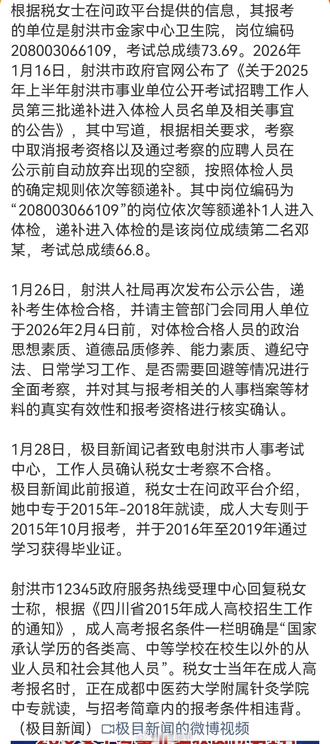 女子考编第1政审不合格后续所谓学历套读的责任不该由考生个人来承担。政审不过的理由是学习时间重叠,依据是《四川省2015年成人高校招生工作的通知》关于成人高考报名条件是“国家承认学历的各类高、中等学校在校生以外的从业人员和社会其他人员”的规定。然而,遂宁卫校和射洪市招生办出具的证明都认为,女子在2015年上遂宁卫校期间报考成人大专符合当时的政策要求。从女生能顺利入学、完成学业,拿到两个毕业证书、顺利毕业来看,当时当地的政策确实也是允许她报考并上学的。如果,女生通过几年含辛茹苦的学习好不容易拿到的成绩单和学历证,却因为一句轻飘飘的“中专与成人大专学历时间重叠”就被全盘否定!着实有些不该!从行政法的角度来看,只要该女生报名时不存在造假和违规行为,既然学校和招生办既然允许女生报考、又让人家交学费攻读、颁发证书,那么该行政许可行为就应该成立且有效。另外,《四川省2015年成人高校招生工作的通知》确实明确规定报考成人高考必须是国家承认学历的各类高、中等学校在校生以外的从业人员和社会其他人员,不能是在校生!但遂宁卫校和射洪市招生办都公开承认女生当时的报考符合当时的政策,但却并未明确当时政策的具体内容。姑且不论省文件和地市级政策的效力问题,当务之急应该将所谓的“当时的政策”公之于众,再对女生拿到两个学历的问题进行评价和定性。无论如何,政策之间的分歧和执行偏差的责任不应该完全由学生用自己的一生去承担。更何况,成人高考招生每年都有,想必这种情况也绝非个案。律师说法以案说法