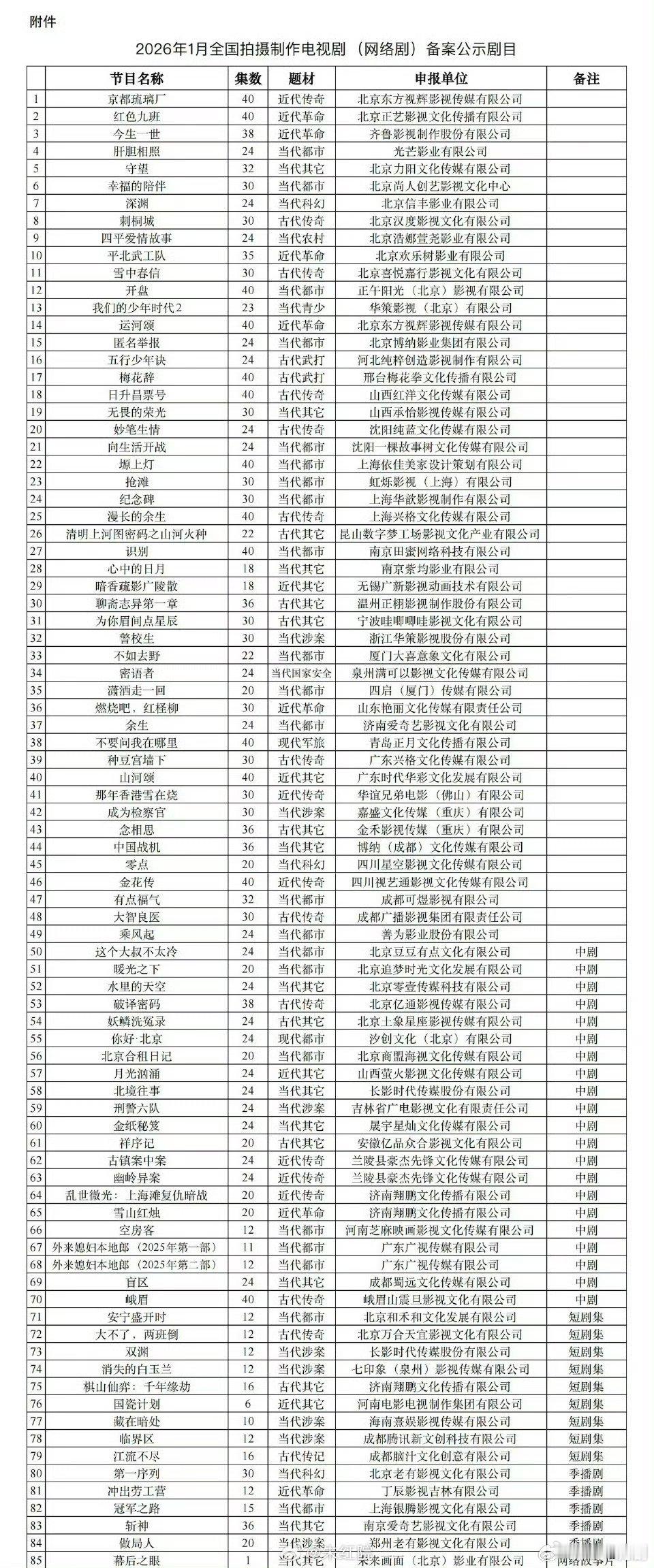 1月电视剧备案公示▪️《开盘》40集,正午阳光▪️《我们的少年时代2》23集,华策▪️《斩神》36集,爱奇艺▪️《第一序列》 30集,老有影视▪️《漫长的余生》40集,兴格文化▪️《为你眉间点星辰》30集,哇唧唧哇▪️《种豆宫墙下》30集,兴格文化▪️《余生》24集,爱奇艺