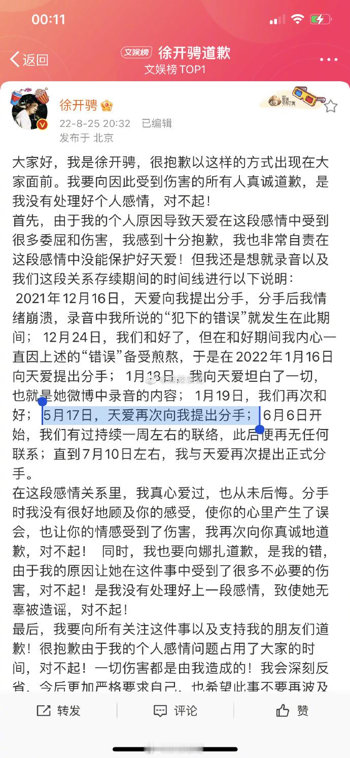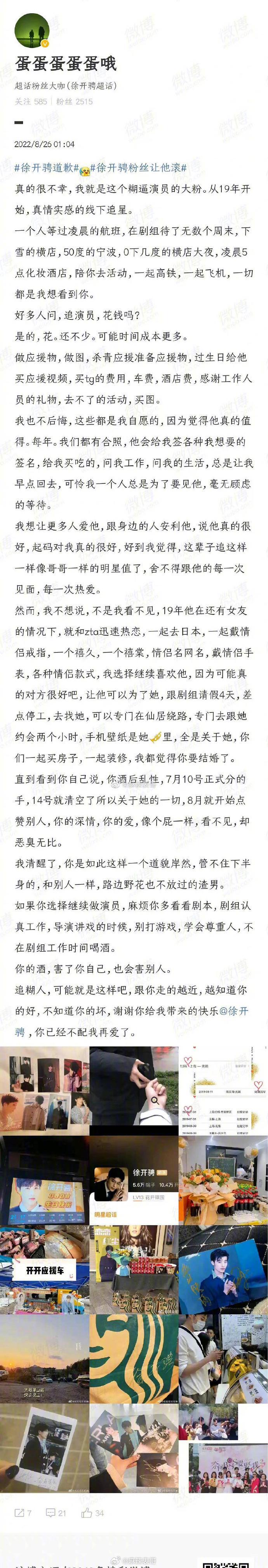 借着徐开骋被曝光有孩子的事情,给大家捋一捋一些八卦2019年9月,媒体拍到徐开骋去无锡接机张天爱,陪伴其拍戏,恋情曝光。2020年3月,徐开骋被拍到现身张天爱家门口拿快递。之后还被扒出同居的痕迹。2021年,徐开骋给张天爱安利作品。2022年5月17日,张天爱参加浪姐3,徐开骋给他直接打call。 2022年4月底,徐开骋古力娜扎合作,7月11日作品杀青。8月,徐开骋多次被拍到深夜去古力娜扎小区。(图5)2022年8月25日,张天爱锤徐开骋,酒后乱性,还不让张天爱公开恋情,也有了名言“爱宝爱宝爱宝,也许那是你爱我的最后一秒 ”。(图6)同天,古力娜扎转发张天爱的博文,说自己做小三是被骗的。(图7)同天,徐开骋道歉。(与8)2022年8月26日,徐开骋大粉发长文,说徐开骋是无缝对接劈腿惯犯,19年徐开骋和张天爱在一起之前,女朋友是演员杨欣颖。(图9)2023年4月,徐开骋发了一张自拍,有粉丝留言“爱宝”,徐开骋回复粉丝“谁没当过谁的宝呀”,还说自己不录音,要不也有“开宝开宝”。(图10)