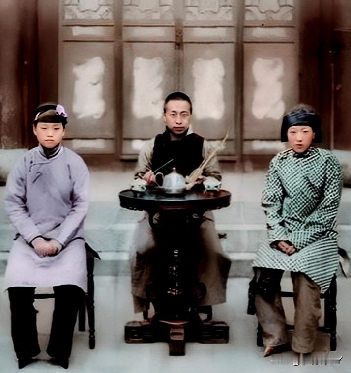 清末时期,一位地主老财家的少爷和两位妻妾坐在院子的合影。这并非演员所扮演,而是货真价实的真品,三人外貌清晰可辨,大家瞧瞧哪位才是正室?