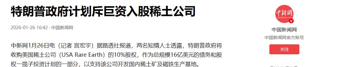 豪掷16亿就能翻盘?特朗普这回恐怕是“肉包子打狗”,想摆脱中国稀土纯属痴人说梦!   当地时间1月26日,白宫方面宣布,向“美国稀土公司”注资16亿美元,换取人家10%的股份。   这可是美国为了摆脱对中国稀土依赖,砸下的最大一笔单笔投资。看来,特朗普这回是真急了眼。但这钱花出去了,事儿能不能成?我看悬!   特朗普政府这回是下了血本,不仅掏了真金白银,还画了一张大饼。按照他们的计划,俄克拉荷马州的磁铁工厂今年晚些时候就要启动,得克萨斯州的稀土矿山也要在2028年投产。   听起来是不是挺像那么回事?早在上个月,美国高官就放话要搞“历史性协议”,要把锂和稀土产能弄回美国本土。如今这16亿美元,就是他们交的“投名状”。   要知道,稀土这东西可是现代工业的重中之重,不管是手机芯片、电动汽车,还是隐形战机、导弹雷达,缺了它根本不行。   美国政客也清楚,这命门被别人捏在手里的滋味不好受。所以他们宁愿打破自己标榜的自由市场规则,也要亲自下场干预。   说白了,这就是一种深度的安全焦虑,生怕哪天中国真给关了,美国的高科技产业和国防机器就得当场趴窝。   然而,这稀土产业的竞争,核心根本不是钱,而是技术积累。美国人以为砸钱就能买来时间,简直是天真。   中国企业早就把高端磁体的镝添加量降低了18%,成本比日本同级产品还能低个20%。   反观美国,本土加工成本比中国高出30%到40%。这还没算上环保和人工成本,真要生产出来,那价格得高到天上去,谁买谁是大冤种。   更讽刺的是,美国现在处于一种极度精神分裂的状态。一方面,特朗普政府计划今年对中国永磁体加征25%的关税,摆出一副要硬刚到底的架势。   另一方面,特拉斯、通用汽车这些巨头却在后院起火,因为买不到原料,不得不求政府批准向中国申请出口许可。   这不就是典型的“搬起石头砸自己的脚”吗?既要打压中国,又离不开中国,这种尴尬的局面,短期内根本无解。   不得不提的是,美国在技术层面上的断层,可不是几年就能补回来的。虽然美国拥有芒廷山口矿这样的大矿,但长期以来就是个“挖土卖泥”的角色,原矿还得运到中国来加工。   为什么?因为他们根本没有成熟的冶炼分离技术。中国掌握了全球90%以上的加工产能,特别是在中重稀土分离上,那是妥妥的专利壁垒。美国以前也有企业试过自建生产线,结果呢?产量连总需求的3%都不到,最后只能关门大吉。   再看看中国这边的布局,那才叫真正的深谋远虑。我们不仅手里握着全球近一半的储量,更是在全球范围内合纵连横。   从“中俄北极稀土走廊”到中非联合采矿项目,中国的主动权早就延伸到了全世界。面对美国的围堵,我们既有出口管制的盾,又有技术迭代的矛。   还有人可能会说,美国毕竟底子厚,万一真让他们搞成了呢?说实话,这种可能性微乎其微。2028年矿山才投产,那时候黄花菜都凉了。   而且,政治斗争充满了变数,特朗普的政策能不能延续下去都不好说。就像网友评论的那样:“美国这是在用百米冲刺的速度跑马拉松,还没到终点,自己先累趴下了。”   这场围绕稀土的博弈,美国看似攻势凶猛,实则步步惊心。16亿美元听着挺多,但在庞大的产业链面前,不过是杯水车薪。   最终这笔钱会不会打水漂,美国会不会在自我孤立的道路上越走越远?咱们不妨坐看这出大戏如何收场。   信息来源: 特朗普政府计划斥巨资入股稀土公司——2026-01-26 16:42·中国新闻网