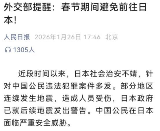 大家信不信,哪怕有外交部的旅行警告,一定仍会有不少人前往日本,而且还会有人发出挑衅式言论。我倒是觉得,对于这帮人就不应该给它们选择,直接禁了赴日游就行了,不给赴日旅游发签证一了百了。 不让赴日游,不是个体安全问题,而是集体安全问题。当日本首相对中国发出军事威胁的时候,就是对全体中国人民下战书。但凡还有点血性、有点民族情感的人,这个时候就应该配合国家开展对日斗争。对了,拒绝赴日游本就不是个经济问题,也是一场中日之间的斗争。 可能有人会抬杠,说日本首相也就嘴上说说,能真敢怎么样?可事实摆在这里,根本不是嘴炮那么简单。2025年11月开始,日本首相高市早苗就故意挑事,公开说台海有事就威胁日本安全,暗示日本可能会介入台海局势。到了2026年1月,她更是变本加厉,直言要是美军在台海冲突中遭到攻击,日本必须作出回应。这话明摆着就是把爪子伸向中国内政,明着对中国进行军事挑衅,这可不是针对某个人,是对着全体中国人民叫板,每一个有良知的中国人都不该忍。 外交部的旅行警告也从来不是无的放矢,更不是故意限制大家出行。2025年11月,中国驻日本大使馆专门发了紧急提醒,明确说日本治安环境持续恶化,中国公民被歧视、求助的案子大幅增加,好几名同胞都遭到了无端辱骂甚至殴打。东京有个留学生下班路上,就被两个日本年轻人拦住骂“滚回中国”,还被打得脸上缝了三针,报警后至今没个说法。大阪一家三口旅游时,在餐厅里被邻桌日本人事先歧视性言论,好好的旅途闹得一肚子气。这些事儿都不是编的,都是实实在在发生在同胞身上的,外交部的警告,本质上就是在保护我们每一个中国人,可偏偏有人当成耳旁风。 更让人膈应的是,有些人心甘情愿无视这些风险,非要往日本跑,跑完还发些挑衅言论,说什么“我花自己的钱,爱去哪去哪”“国家管得太宽”。这种话听着就上火,真不是说不让你花钱享受,是你花钱的地方,正在拿着钱反过来对付你的国家。日本2026财年的防卫预算都涨到9.04万亿日元了,连续14年一直在涨,这笔钱要用来买高超音速导弹、建宇宙作战集团,还要升级冲绳的军事力量,明眼人都能看出来,这些装备好多都是冲着中国来的。而日本旅游业特别依赖中国游客,大阪有家旅游公司30%到40%的顾客都是中国人,京都一家餐饮店80%的外国顾客是中国人,中国游客一减少,他们营业额直接腰斩。你以为你花的是旅游钱,说不定就变成了日本用来研发武器的经费,这不是变相给敌人送子弹吗? 咱们再掰扯清楚,拒绝赴日游真不是跟经济过不去,这就是一场实打实的斗争。中国早就不是以前那个任人拿捏的样子了,面对日本的挑衅,咱们已经拿出了实际行动,拒绝批准日本新任驻重庆总领事的任命,在联合国直接定性日本是“国际秩序破坏者”,还加强了稀土出口管控、取消了多条赴日航班。这些动作都是在跟日本博弈,而普通民众能做的,就是站稳立场,不往日本送钱送人气,这不是什么高大上的口号,是每个中国人该有的底线。那些非要顶风赴日还挑衅的人,说白了就是没骨气,忘了日本高层的军事威胁,忘了同胞在日本遭遇的不公,忘了国家正在经历的较量。 所以说,直接禁了赴日游、不发签证,真不是小题大做,反而是最干脆利落的办法。不给那些没血性的人挑事的机会,也不让我们的钱变成对准自己的炮弹,更能明确告诉日本,挑衅中国是要付出代价的。国家在前面为我们遮风挡雨,跟日本进行着方方面面的斗争,我们普通人就算帮不上大忙,也别添乱、别拖后腿。毕竟,在集体安全面前,个人的所谓“自由出行”根本不值一提;在民族大义面前,那些挑衅式的言论,只会显得自己无比可笑和卑微。