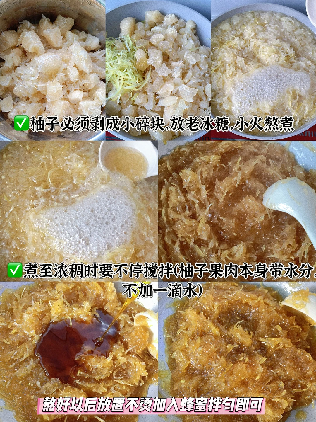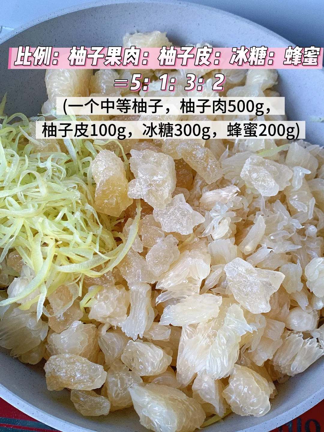 ✅低卡黄金配比:柚子肉:柚子皮:冰糖:蜂蜜=5:1:3:2(冰糖减量,低卡无负担)