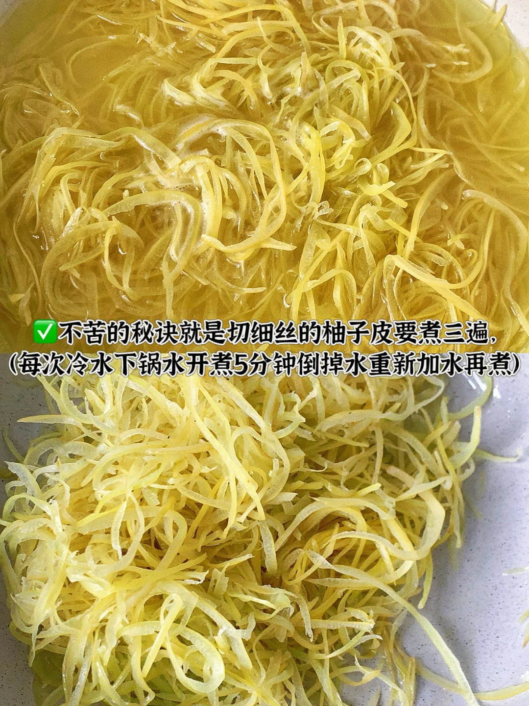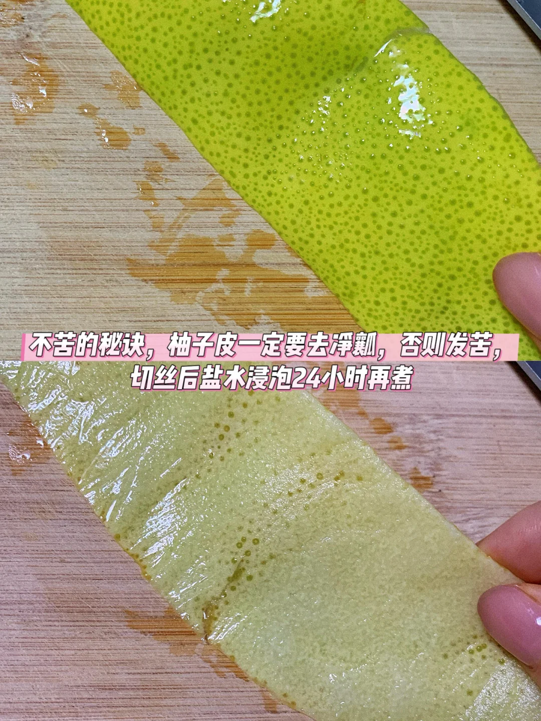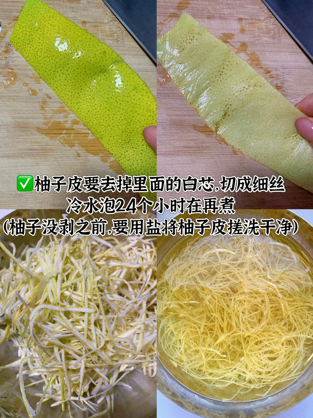 [一R]柚子皮刮净白瓤(去苦核心!剩一点就苦),切丝淡盐水泡24小时,煮三次