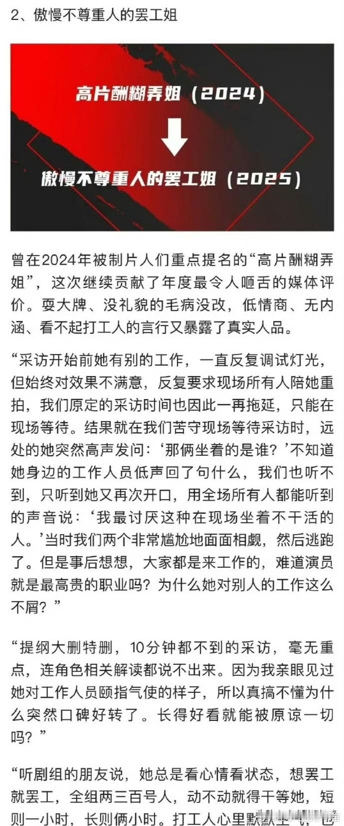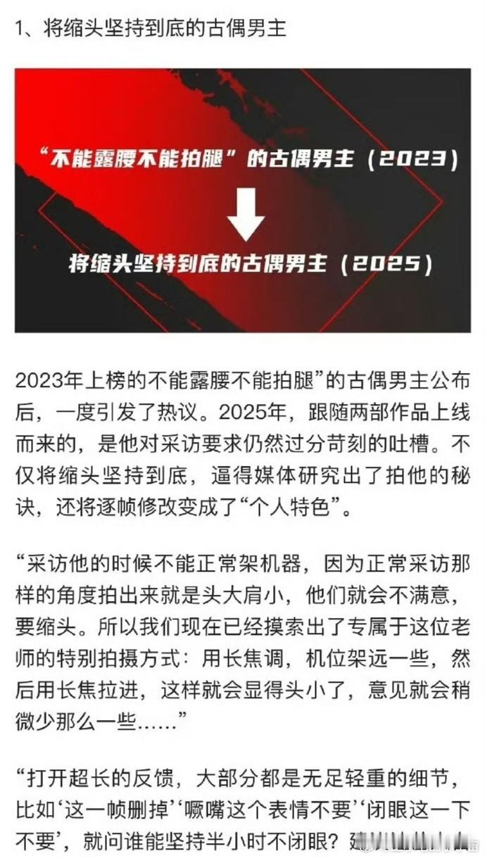 能猜出来吗?2025搜狐黑榜艺人:一、将缩头坚持到底的古偶男主二、傲慢不尊重人的罢工姐三、贯彻妈宝风格的大男主第一个和第三个很明显,至于第二个其实应该也能想到,毕竟同时兼顾“罢工”和“被制片人点名”只有那位!