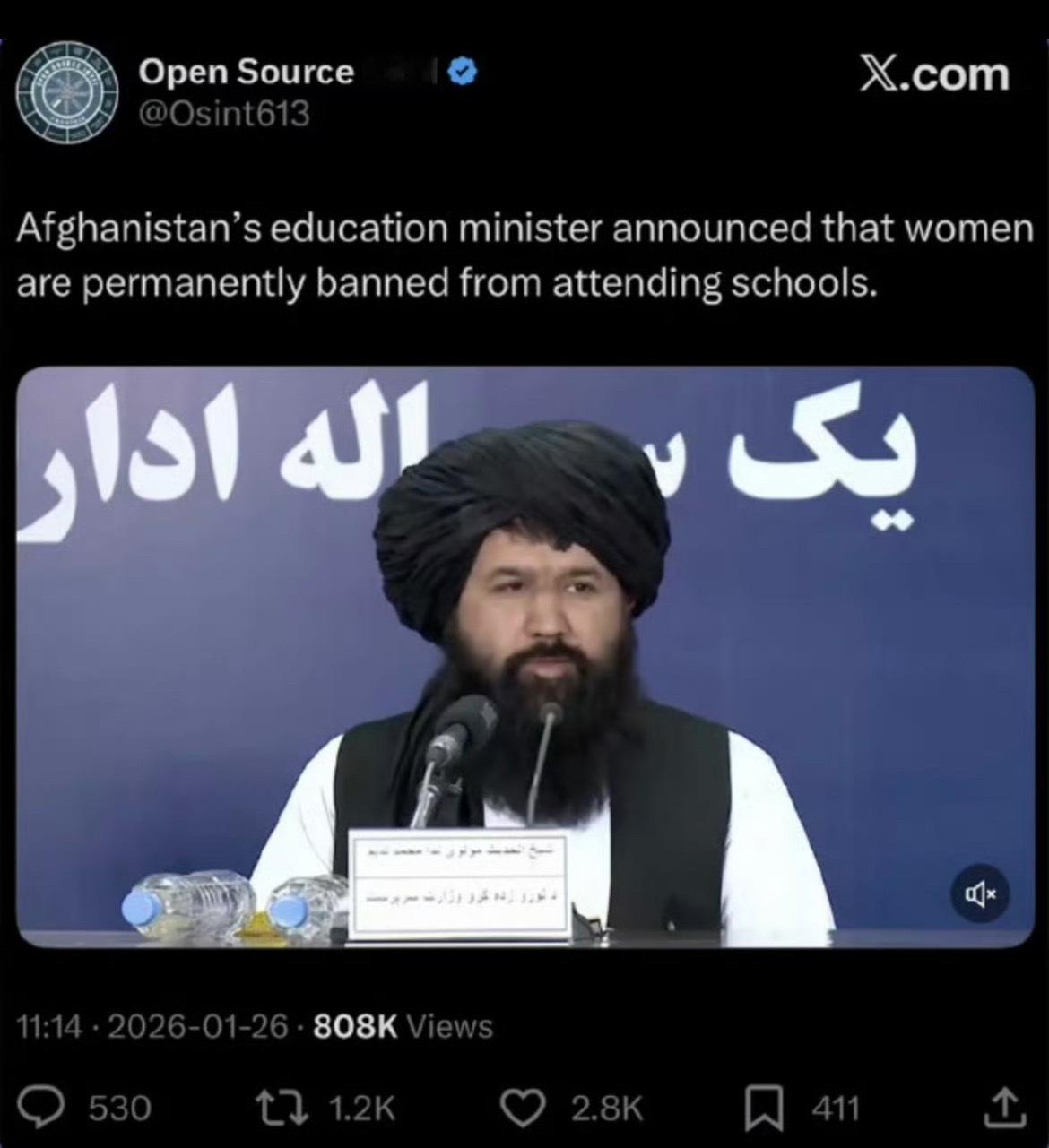 阿富汗教育部宣布:永久禁止女性上学。