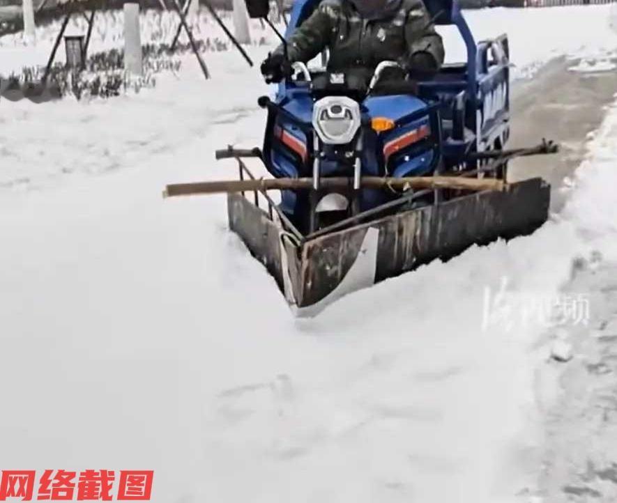 河南洛阳有下雪后在一处小区内,小区物业的工作人员上演一幕除雪场景。 这里物业工作人员没有用铲子,也没有撒什么化雪的物剂,而是在用电动三轮车前面分别做了两块板,模仿推车的功能,于是看到随着电动三轮车的前行,则前方的雪立马被隔离到两侧,中间就留下了干净的通行道。 可见工具虽说简单,但实际的效果还是不错,这也让众人对于这样的方式为之佩服,物业也是表态这也是他们在下雪天一直选用的方式,没有想到还能得到众人的支持,但也有人提出异议,在小区内有必要如此吗,其实可以理解小区内也需要通勤便利,这个还是有必要。 这里还是在生活中总结生活,看到实则的铲雪车也是如此原理,这不简化繁琐让最初原理生活的构想,成为解决眼前生活的好办法,这里为大道至简,有时真得没有必要想法复杂,最为简单的用法也可以解决问题。