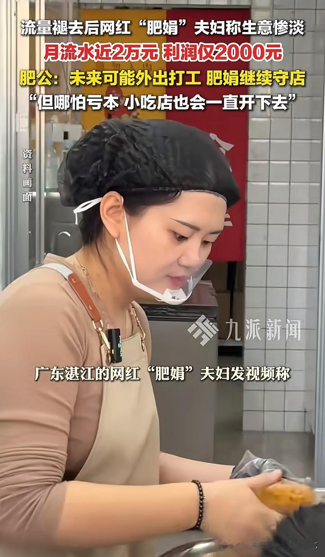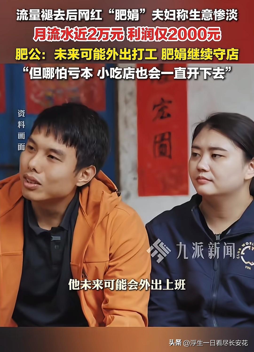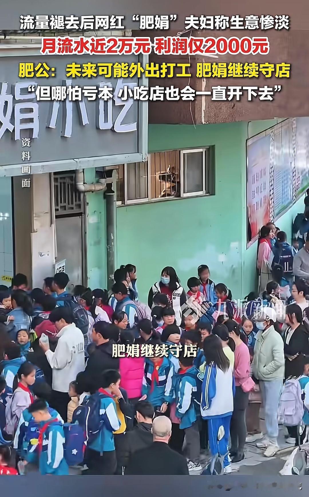 网红“肥娟”夫妇没流量了,肥公打算外出打工,肥娟继续守店,或者考虑关店,大家信吗?事实上,“肥娟”夫妇走红的一个月里就已经赚到了大多数人一辈子都赚不到的财富,所以流量褪去,持续时间虽短,但至少也赚的盆满钵满,下一步怎么走都可以算得上体验生活了。 2025年初,“肥娟”夫妇凭借“免费让小学生看电视”爆火后,直播打赏收入极高,巅峰单场打赏可达30多万元。2025年6月前后,他们放弃“永不带货”的承诺开启直播带货,30天直播50场,带货总额达250万元,月入可观。 据了解,去年11月“肥娟”夫妇店铺销售额20117.7元,12月降至16689.5元,扣除成本后每月毛利润仅约2000元;店内火鸡面和薯条品类两月毛利合计不足500元。如今夫妇俩坦言开店至今几乎没赚钱,大家也可以理解成赚的钱越来越少了,比巅峰爆红期少的太多太多了。 流量褪去的背后还是“肥娟”夫妇没有去规划,没有去运营,在热度高涨时没有及时将流量转化为私域用户,甚至还变了初衷,早已从“暖心夫妻”到“功利商人” ,一切都变味了。最后就是当地文旅的退出,“肥娟”夫妇的走红只能是昙花一现。说到底还是赚了大钱永远不知足,没有给家人们和孩子谋更多的福利,没有将经济收益转化为社会价值,“肥娟”夫妇想重回巅峰已经不可能了。