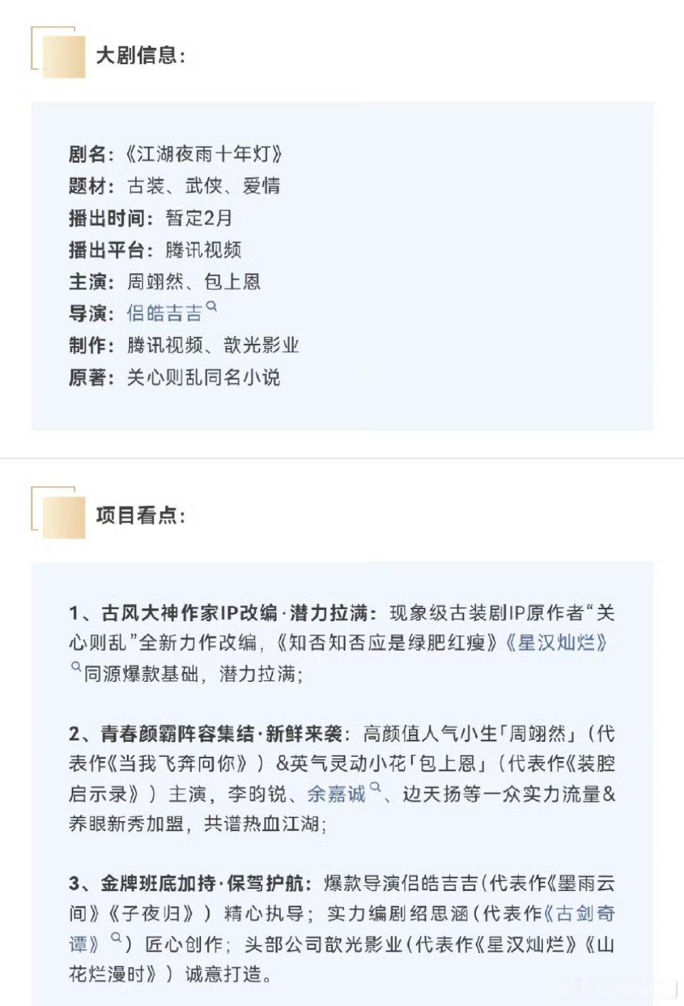 【二胖发布】江湖夜雨十年灯开启招商 由侣皓吉吉导演,周翊然、包上恩主演,李昀锐客串的古装剧《江湖夜雨十年灯》正式开启播前招商,2月23日起腾讯视频独家开播!