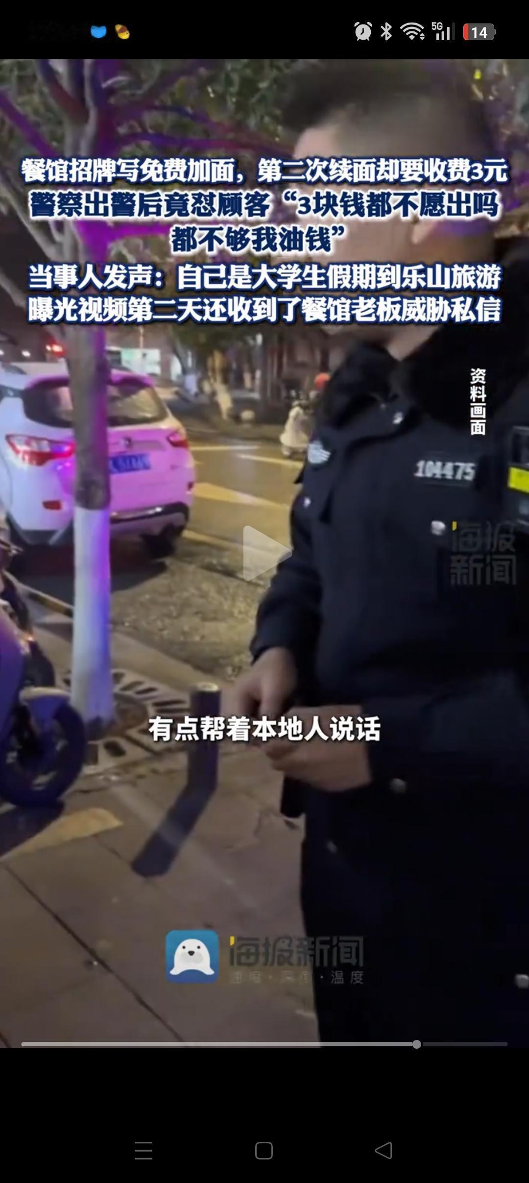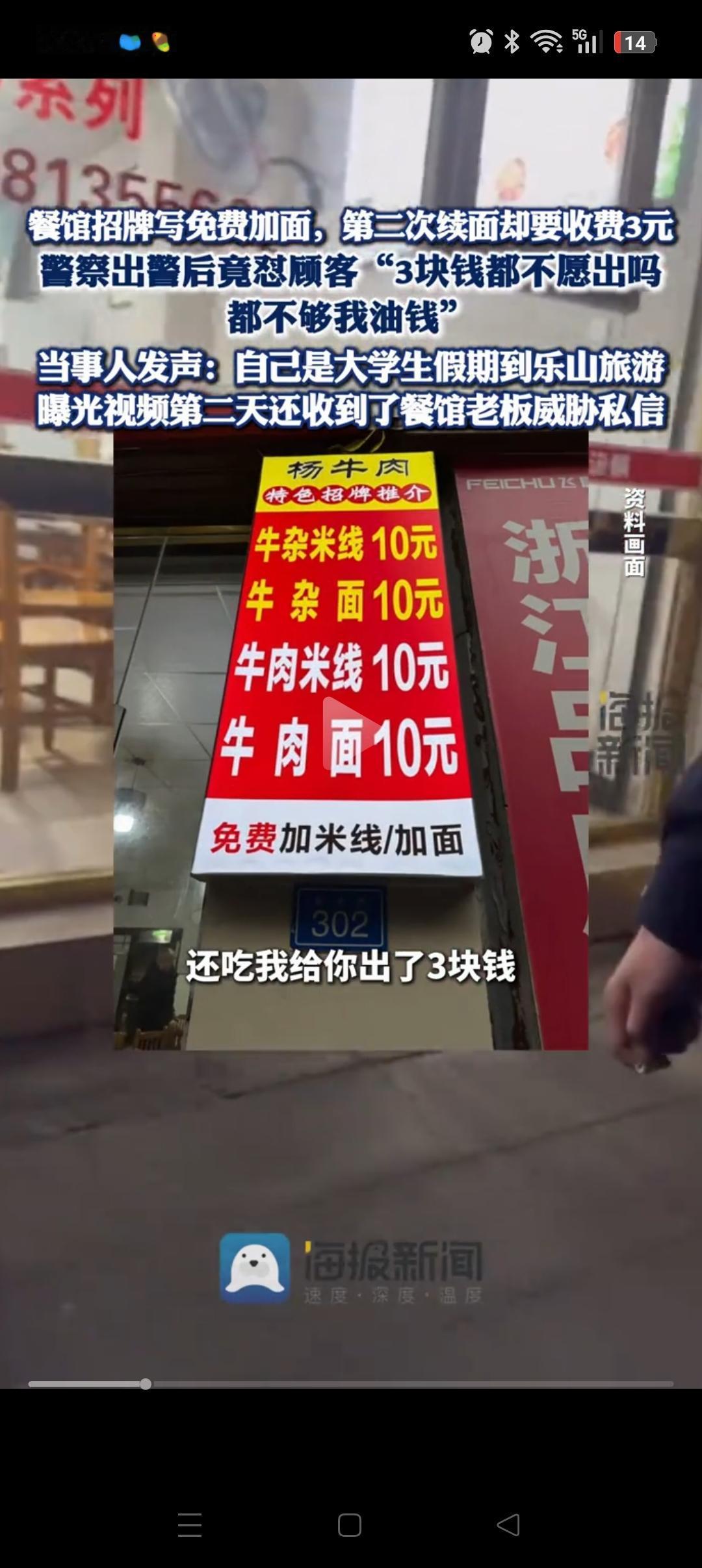 “这大学生多少有点丢人了”,四川乐山,一大学生到面馆吃面。因为面碗写了“免费续面”,他吃了二碗还不够,要求继续来一碗。老板却不乐意了,要求他加3块钱,要不然不续面。 两个人争吵后,谁也说服不了谁!便请来了帽子叔叔,帽子叔叔到现场后,也无法让两个人和解。便无奈的说:3块钱都不愿意出吗?都不够我油钱的。你还要吃的话,这3块钱我给了。 旁边围观的群众这时也凑起了热闹,表示给他10块钱,让他走。于是老板把10块钱退给他了,大学生也不客气,拿着10块钱走了。 这事其实两个人都没啥大错,但是大学生有点计较了。人家已经续了一次面,而且面才10块钱一碗,挺便宜的,没必要还闹得这么大。最后拿走老板的10块钱,也让人觉得不够大气。 当然老板也应该把续面的事写清楚了,具体能加几次面,免得再闹得这么不愉快。 那么大家都是怎么看待这件事的呢?