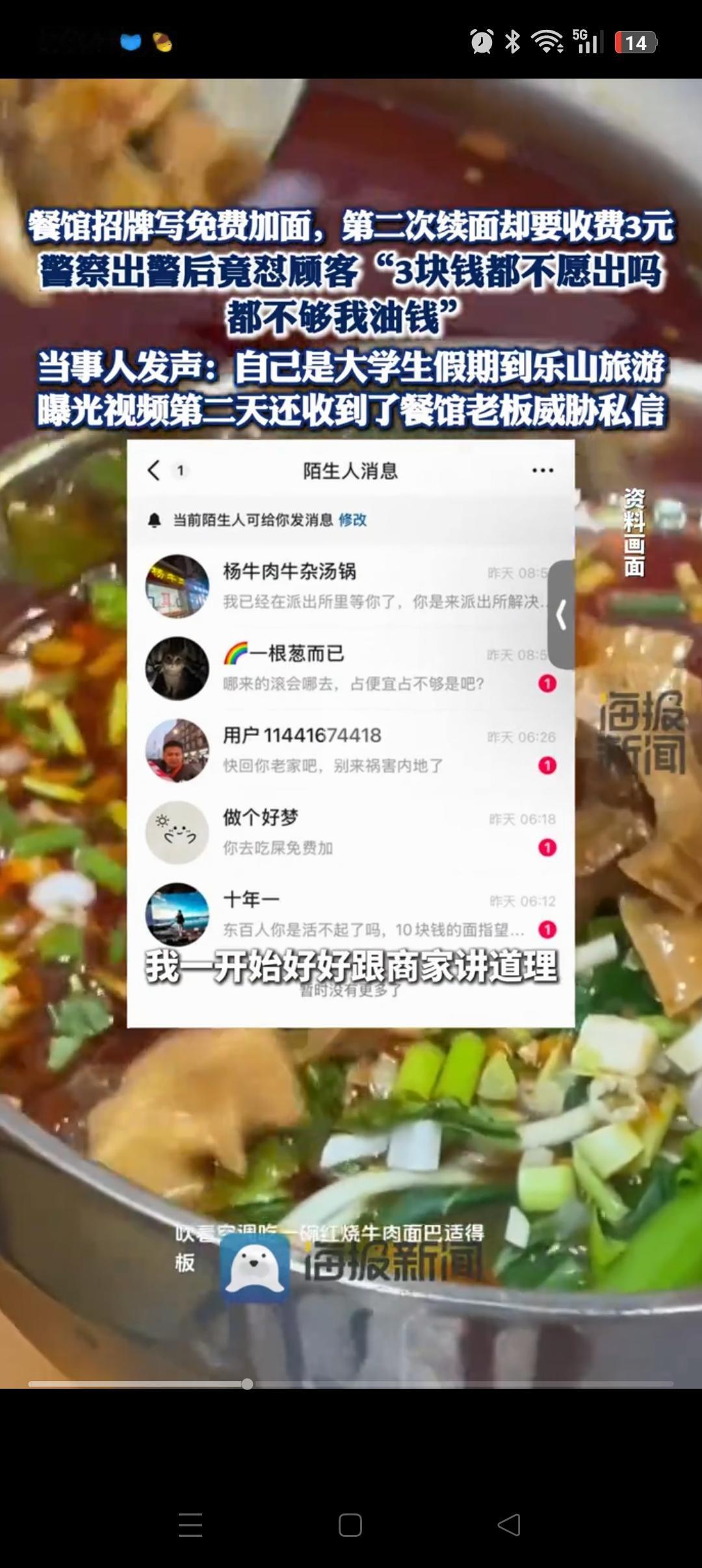 “这大学生多少有点丢人了”,四川乐山,一大学生到面馆吃面。因为面碗写了“免费续面