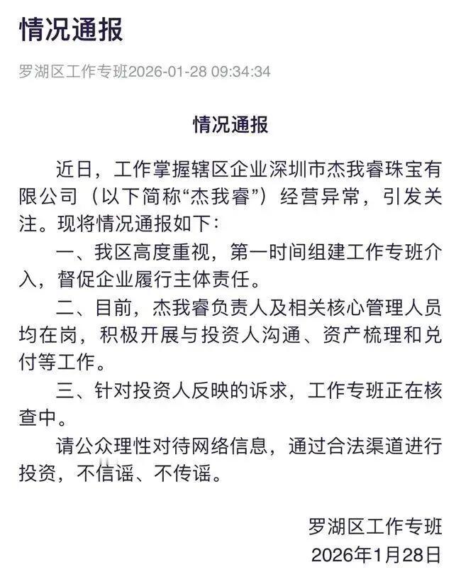 水贝爆雷,引发投资者恐慌。近日,深圳水贝黄金预定价平台“杰我睿”兑付困难,引发投资者恐慌。1月28日,深圳市罗湖区工作专班发布通报称,该区第一时间组建工作专班介入,督促企业履行主体责任。目前杰我睿负责人及相关核心管理人员均在岗,积极开展与投资人沟通、资产梳理和兑付等工作。 评:深圳水贝黄金平台爆雷,借实物黄金交易之名行非法期货之实,超高杠杆撕开兑付缺口,数百亿涉资牵连全国散户,恐慌情绪蔓延。当地火速组建专班督促兑付,是维稳市场的及时之举,但绝不能止于“督促”。投资者盼的不是一纸通报,而是真金白银的足额兑付,而非平台提出的本金打折方案。水贝作为黄金珠宝交易核心区,此番爆雷暴露行业监管漏洞。唯有紧盯兑付进度、深挖非法交易根源,严肃追责涉事方,同时补上监管短板,才能抚平恐慌,守住市场信誉与投资者的钱袋子。社会热点 深圳水贝黄金平台爆雷 深圳成立工作专班