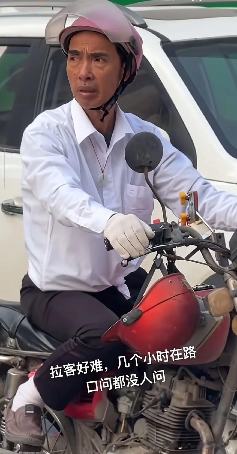 跑摩的大叔无奈眼神! 今早路过路口,撞见这位摩的大叔,瞬间破防了。 他穿着洗得发白的白衬衫,戴着半旧的头盔,坐在红色摩托上,眼神里全是熬了大半天的疲惫和迷茫。几个小时守在路口,问了无数句“搭车吗?”,换来的全是路人匆匆的背影。 这哪是一个摩的师傅,分明是每个在生活里硬扛的普通人。我们为了碎银几两,挤早高峰地铁、改方案到凌晨,和他在路口等客的样子,本质上都是在和生活死磕。 有人说现在网约车多了,摩的不好跑了。可谁又能轻易换掉手里讨生活的家伙?他攥着车把的手,和我们攥着工资条的手一样紧。 这世道,谁不是一边崩溃一边硬撑?你今天也在为生活拼尽全力吗?