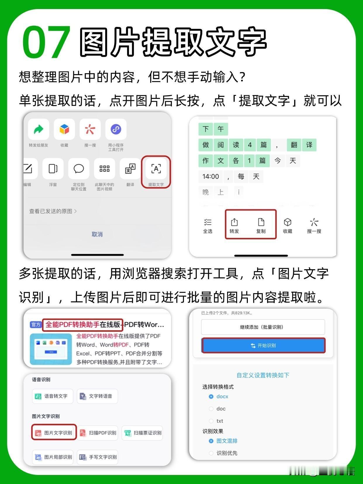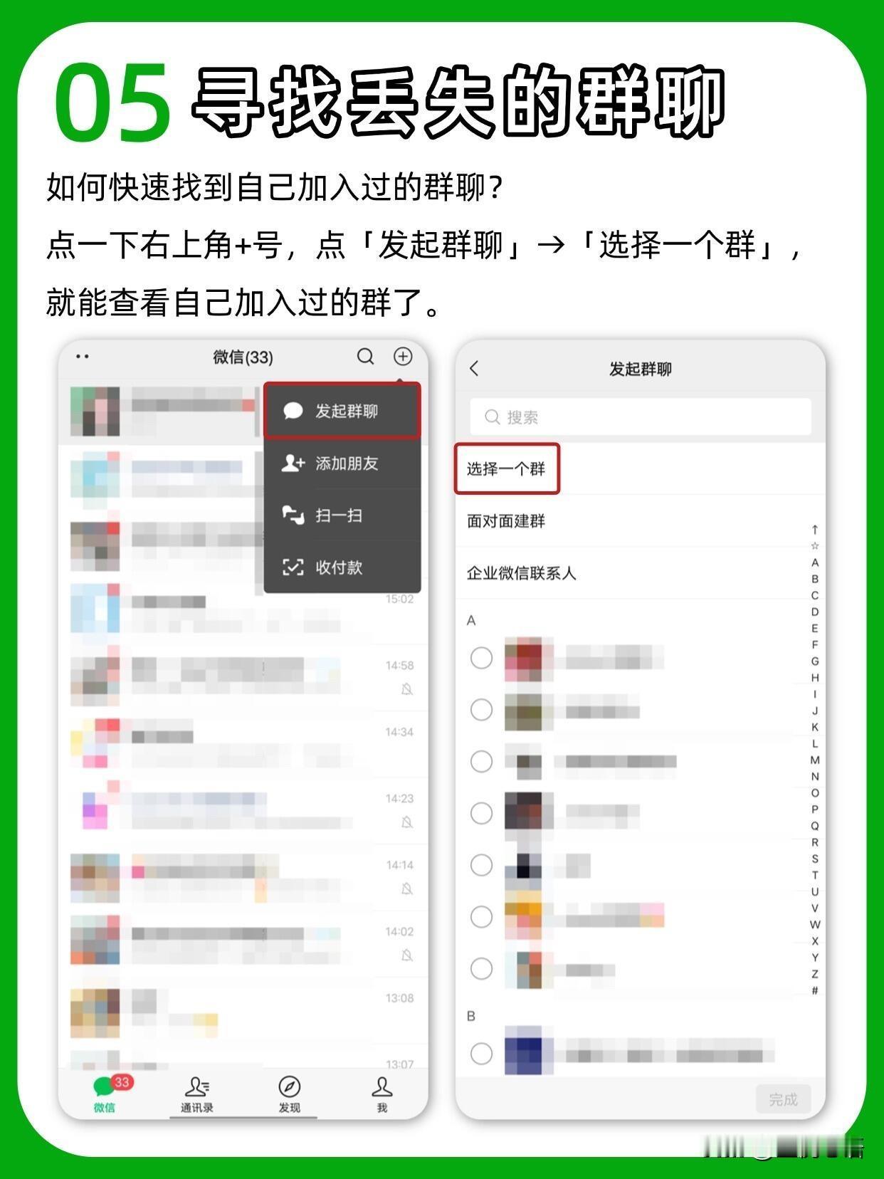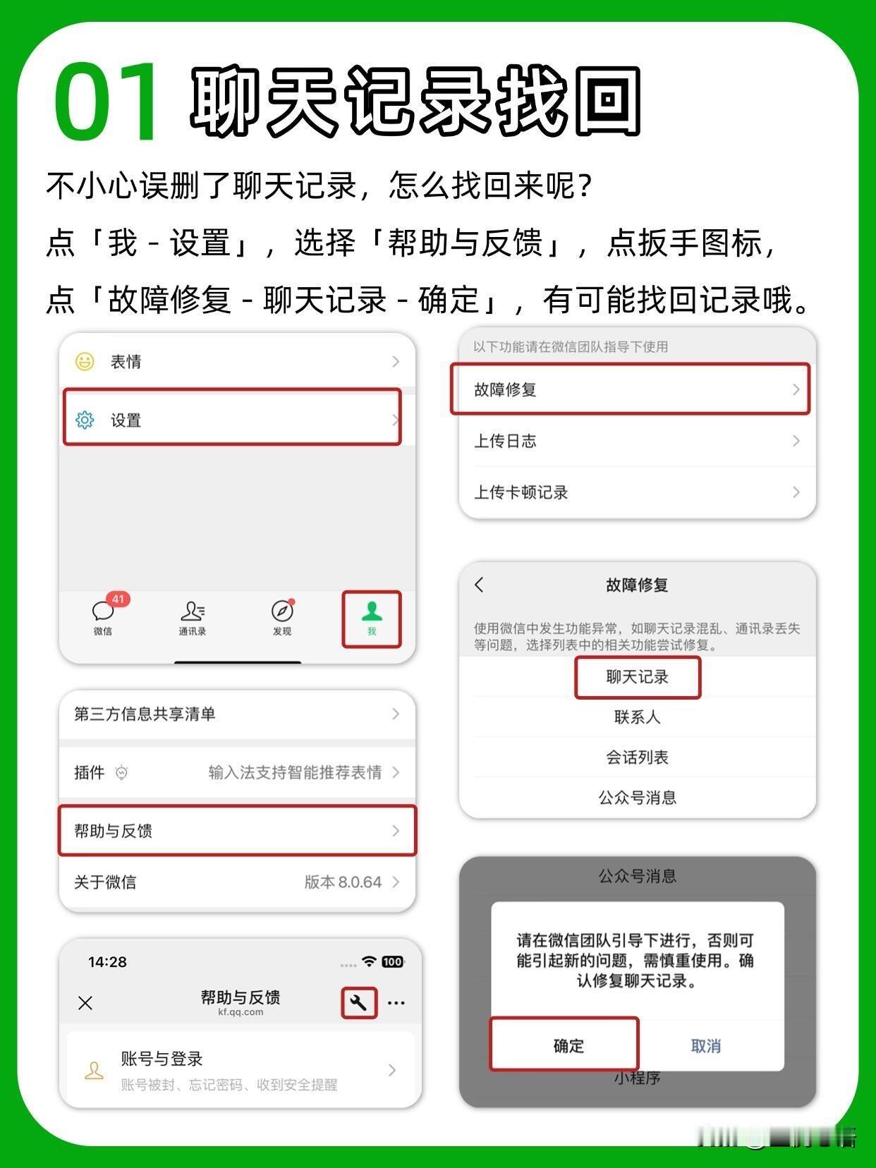你真的会用微信吗? 天天用微信居然藏着这么多神仙功能😭 以前白瞎了多少时间! 误删聊天记录别慌! 设置→帮助与反馈→扳手图标→故障修复, 说不定就能找回来,亲测有用! 待办事项记收藏里, 再设个聊天置顶, 比备忘录还省心,再也不会忘事啦~ 开会不用狂写笔记, 收藏里开语音输入, 直接转文字,效率直接拉满! 发图再也不用忍模糊画质, 聊天框点+选文件, 从手机相册选图,原图发送超清晰! 还有一键拼图、图片提取文字, 不用再装额外App,微信里全搞定! 找不到的群聊, 点右上角+→发起群聊→选择一个群, 就能全部看到~ 长按文本框有惊喜! 全屏输入写长消息超爽, 边写边译和外国朋友聊天无压力~ 这些隐藏技巧真的太实用了, 每个都能让我们省出好多时间!